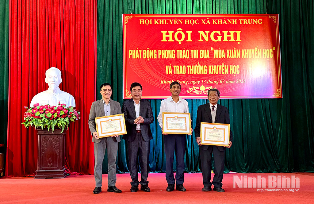Ngay trong lễ phát động, Hội Khuyến học xã đã trao bảng vàng khuyến học cho các tập thể, cá nhân có thành tích xuất sắc trong phong trào xây dựng Quỹ Khuyến học - khuyến tài xã Khánh Trung năm 2026; trao giấy khen và quà cho 139 em học sinh có thành tích học tập xuất sắc trong năm học 2024-2025 và 2025-2026.