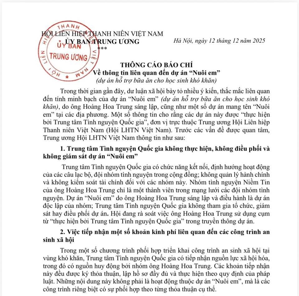 Chiều 12/12, Trung ương Hội Liên hiệp Thanh niên Việt Nam đã phát đi thông tin chính thức gửi các cơ quan báo chí về dự án “Nuôi em” – vấn đề đang thu hút sự quan tâm của dư luận.