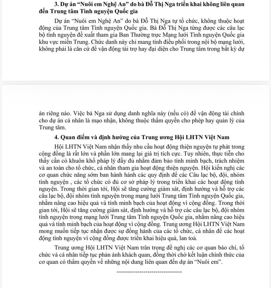 Trung ương Hội cũng cho biết dự án “Nuôi em Nghệ An” do bà Đỗ Thị Nga tổ chức là hoạt động riêng, không thuộc Trung tâm Tình nguyện quốc gia. Bà Nga từng được một số câu lạc bộ tình nguyện giới thiệu tham gia Ban Thường trực Mạng lưới Tình nguyện quốc gia khu vực miền Trung, chức danh mang tính điều phối nội bộ và không phải căn cứ để vận động tài trợ hay đại diện Trung tâm trong bất kỳ dự án nào. Việc sử dụng danh nghĩa này (nếu có) để gây quỹ cho dự án cá nhân là hành vi mạo nhận, không nằm trong phạm vi cho phép hay quản lý của VVC.