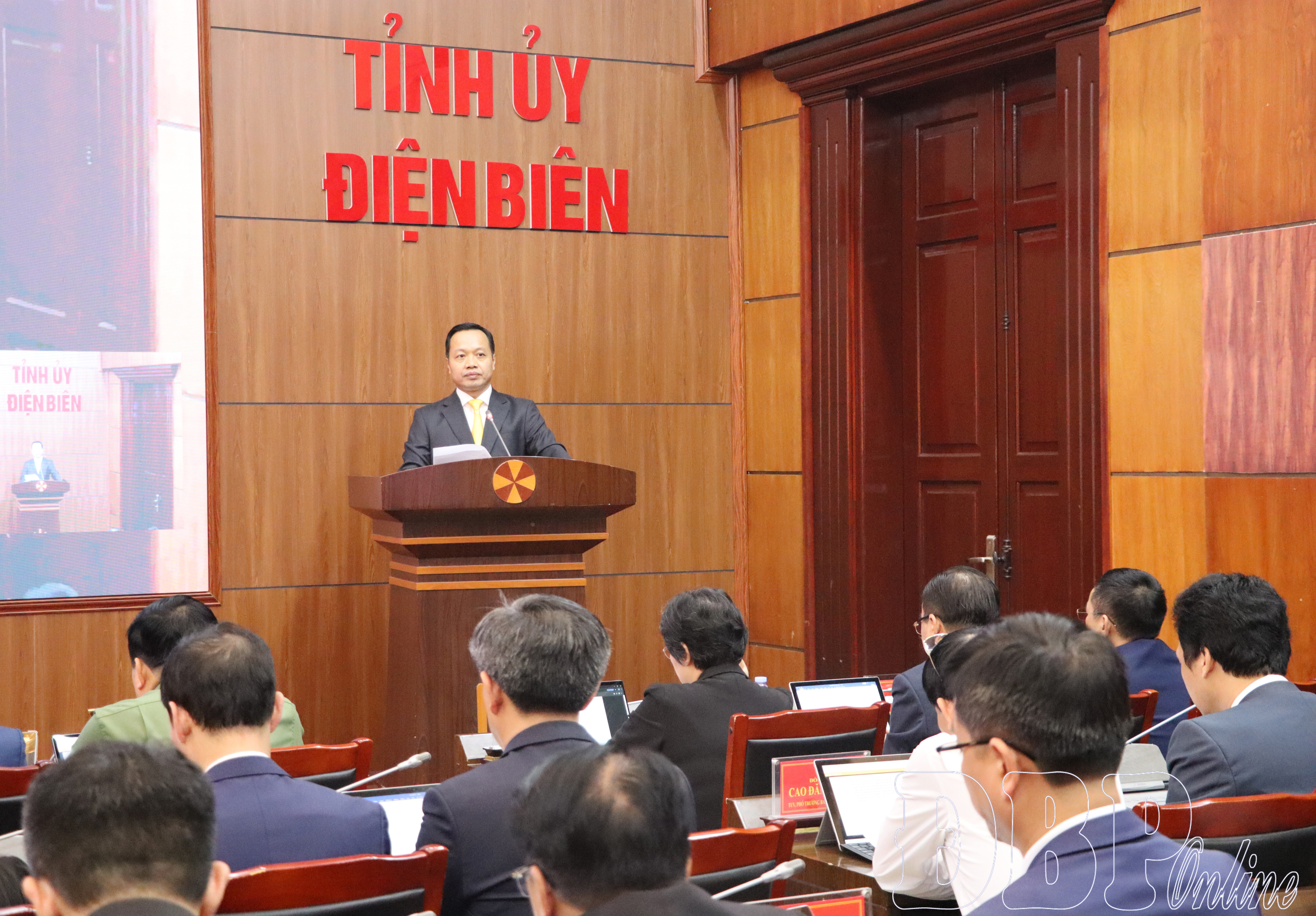 Hội nghị nghe Thường trực Tỉnh ủy trình bày dự thảo báo cáo tình hình thực hiện nhiệm vụ chính trị quý I, phương hướng nhiệm vụ trọng tâm quý II năm 2026 của Tỉnh ủy. Đại diện Đảng ủy UBND tỉnh báo cáo nội dung điều chỉnh, bổ sung một số chỉ tiêu, nhiệm vụ, giải pháp phát triển kinh tế - xã hội năm 2026 ban hành tại Nghị quyết số 04-NQ/TU, ngày 5/12/2025 của Ban Chấp hành Đảng bộ tỉnh và trình bày dự thảo Nghị quyết của Ban Chấp hành Đảng bộ tỉnh về phát triển kinh tế - xã hội vùng đồng bào dân tộc thiểu số và miền núi gắn với thực hiện mục tiêu giảm nghèo bền vững và an sinh xã hội tỉnh Điện Biên giai đoạn 2026 – 2030, định hướng đến năm 2035.