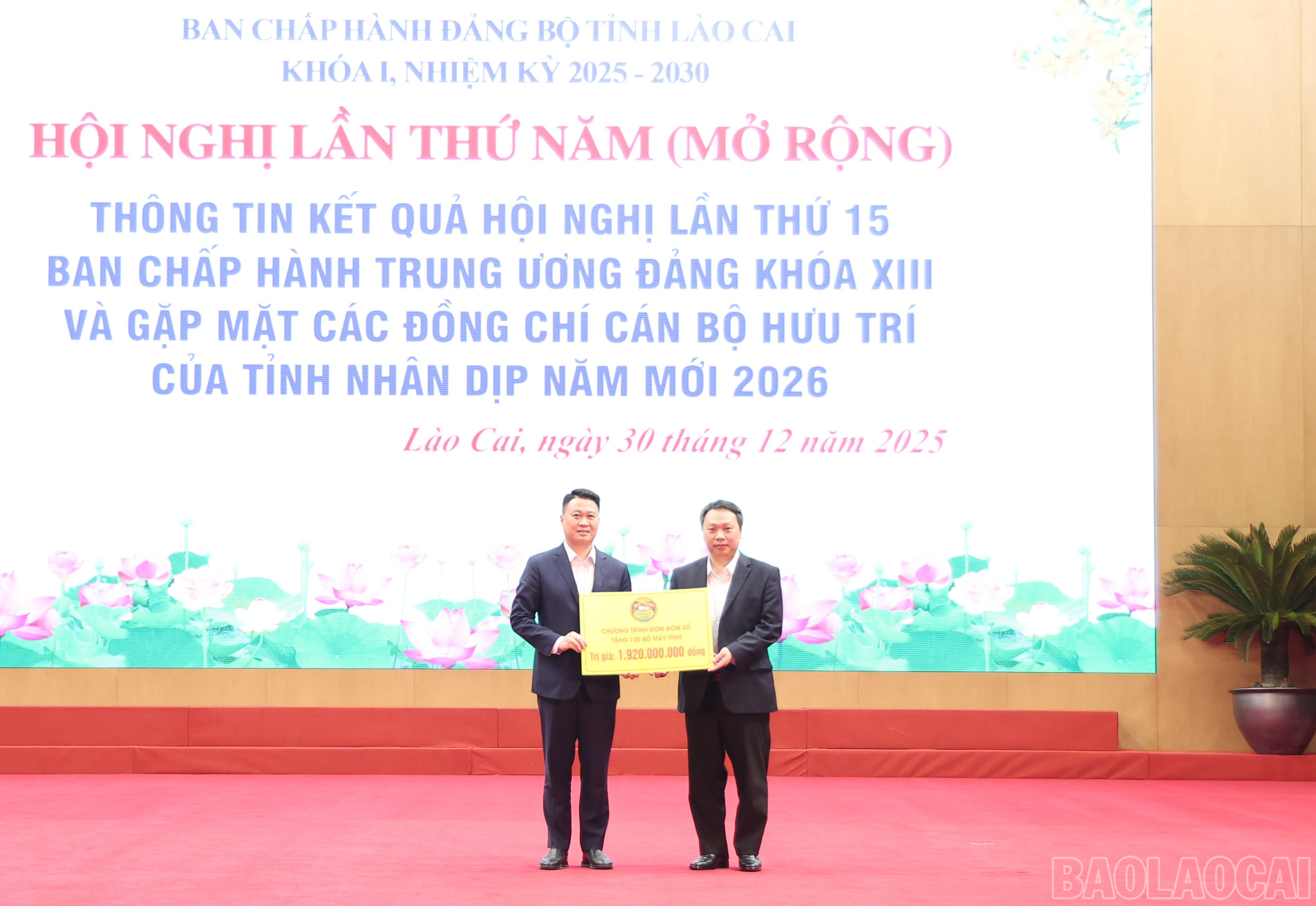Tiếp đó, đồng chí Bí thư Tỉnh ủy Trịnh Việt Hùng cùng các đồng chí lãnh đạo tỉnh Lào Cai đã tặng hoa chúc mừng đồng chí Trần Huy Tuấn - Nguyên Phó Bí thư Tỉnh ủy, nguyên Chủ tịch UBND tỉnh Lào Cai đã được Trung ương điều động nhận nhiệm vụ công tác mới - Chủ tịch UBND tỉnh Ninh Bình từ tháng 11/2025. Thay mặt Ban Chấp hành Đảng bộ tỉnh, đồng chí Bí thư Tỉnh ủy Trịnh Việt Hùng cảm ơn, ghi nhận những đóng quan trọng của đồng chí Trần Huy Tuấn trong quá trình công tác tại tỉnh Lào Cai và mong muốn đồng chí tiếp tục phát huy sở trình, năng lực công tác ở cương vị mới tại tỉnh Ninh Bình.