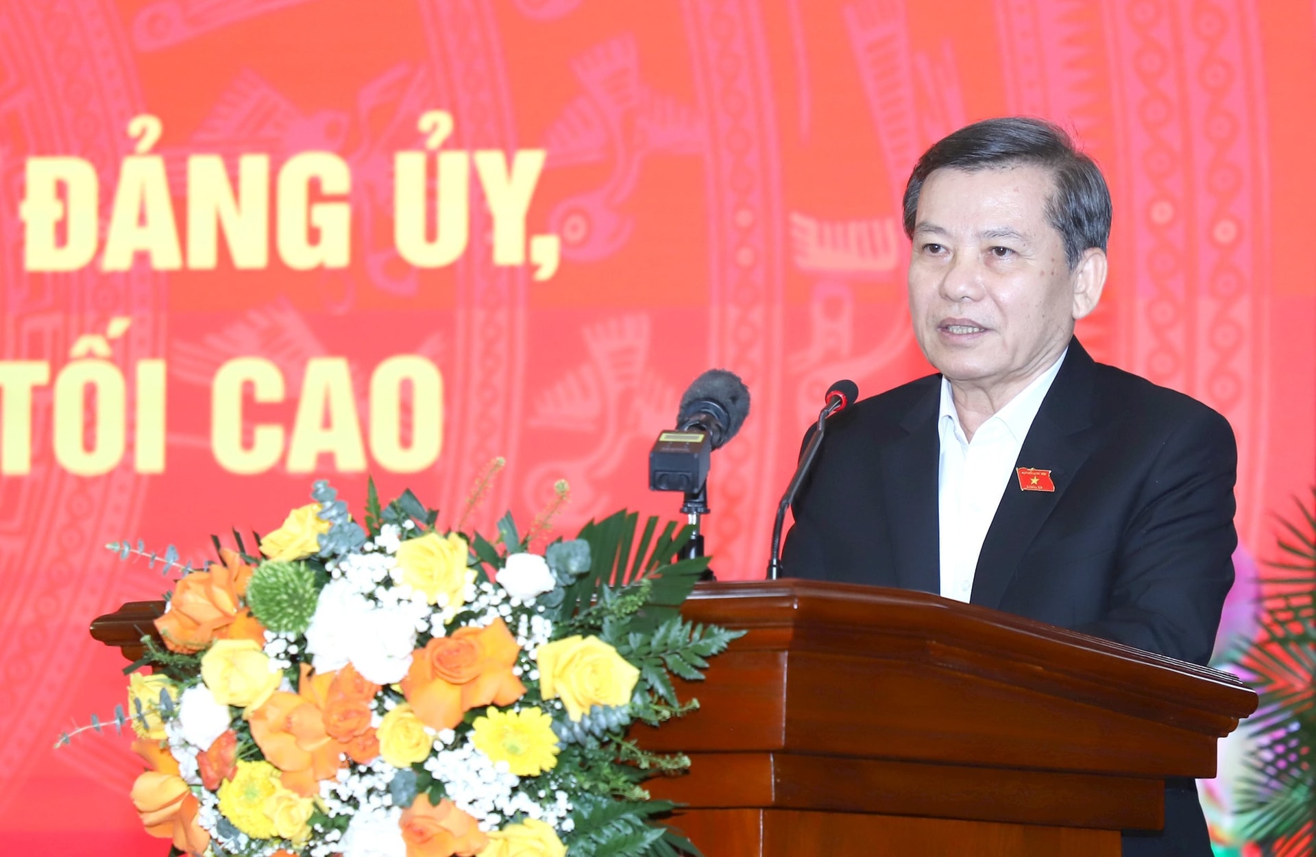 Đồng chí Nguyễn Văn Quảng, Ủy viên Trung ương Đảng, Bí thư Đảng ủy, Chánh án TANDTC phát biểu tại hội nghị.