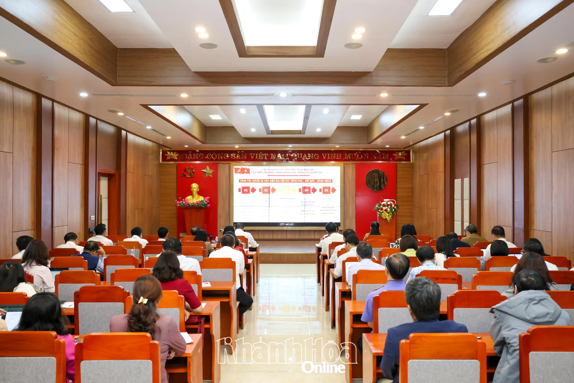 Các đồng chí lãnh đạo tỉnh và các đại biểu dự hội nghị tại điểm cầu Tỉnh ủy Khánh Hòa.
