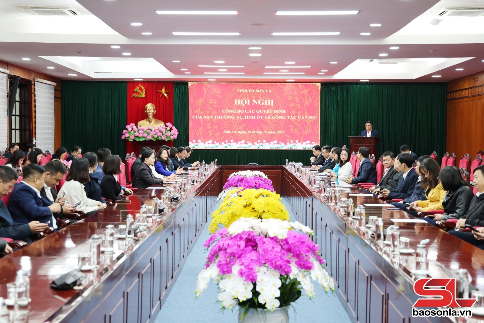 Hội nghị đã công bố Quyết định số 98-QĐ/TU ngày 15/12/2025 của Ban Thường vụ Tỉnh ủy về việc điều động, phân công đồng chí Lường Thị Vân Anh, Ủy viên Ban Thường vụ Tỉnh ủy, Chủ nhiệm Ủy ban Kiểm tra Tỉnh ủy nhận công tác tại Ban Nội chính Tỉnh ủy, bổ nhiệm giữ chức Trưởng ban Nội chính Tỉnh ủy; Quyết định số 99-QĐ/TU ngày 15/12/2025 của Ban Thường vụ Tỉnh ủy về việc điều động, phân công đồng chí Dương Tú Anh, Ủy viên Ban Thường vụ Tỉnh ủy, Trưởng ban Nội chính Tỉnh ủy nhận công tác tại cơ quan Ủy ban Kiểm tra Tỉnh ủy.