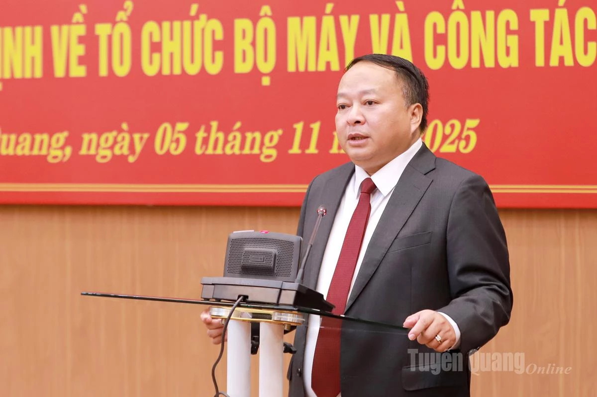 Công bố các Quyết định của Ban Thường vụ Tỉnh ủy và Chủ tịch UBND tỉnh về việc: Điều động, bổ nhiệm đồng chí Vân Đình Thảo, Ủy viên Ban Thường vụ Tỉnh ủy, Giám đốc Sở Tài chính giữ chức Trưởng Ban quản lý các khu công nghiệp và khu kinh tế tỉnh Tuyên Quang; bổ nhiệm đồng chí Phạm Kiều Vân, Phó Giám đốc Sở Tài chính giữ chức Giám đốc Sở Tài chính; tiếp nhận và phân công bà Khánh Thị Xuyến, Chánh thanh tra tỉnh đến nhận công tác tại Đảng ủy xã Yên Sơn và chỉ định tham gia Ban Chấp hành, Ban Thường vụ Đảng ủy, giữ chức Bí thư Đảng ủy xã Yên Sơn nhiệm kỳ 2025 – 2030.