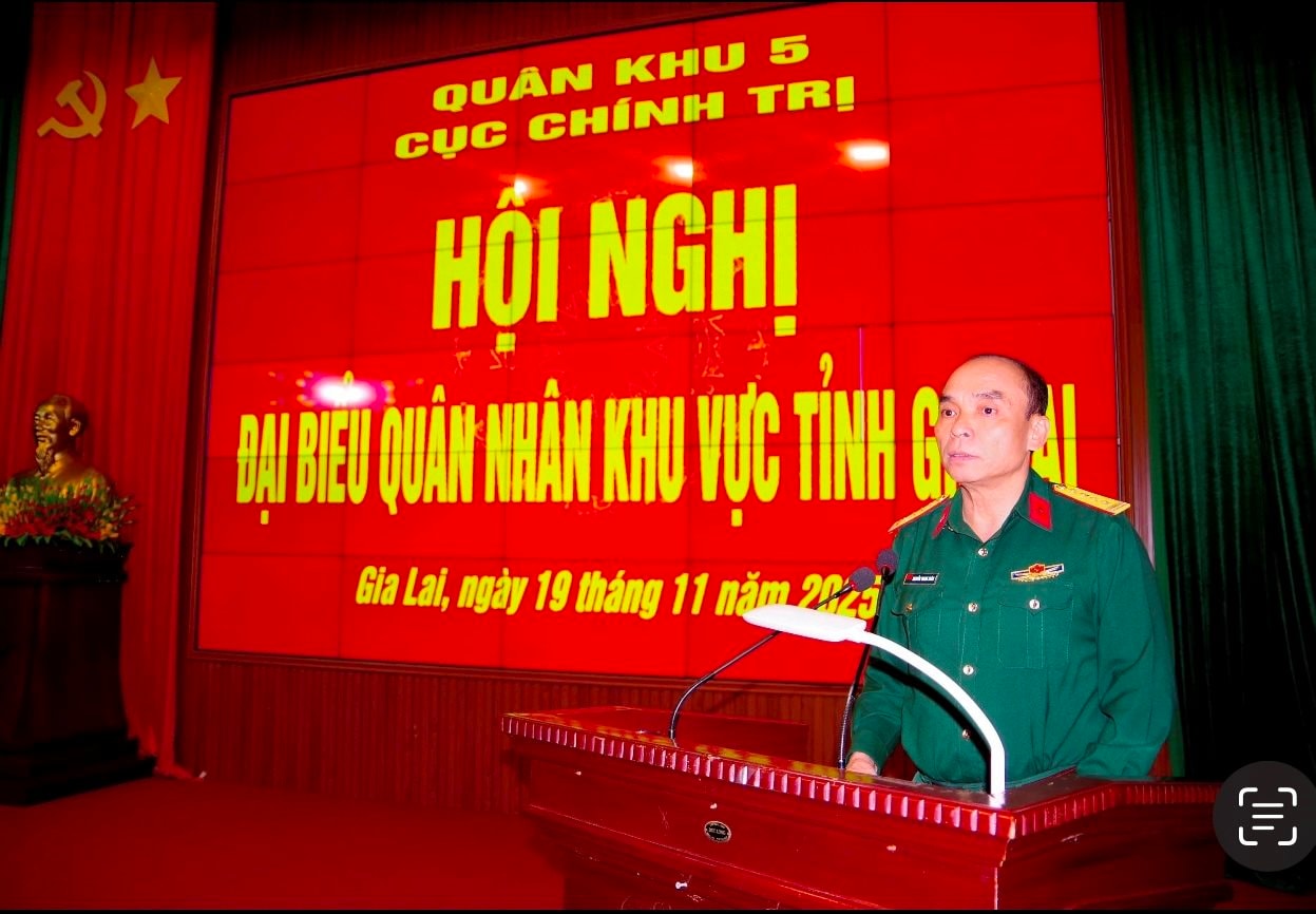 Đại tá Nguyễn Thanh Xuân, Phó Chủ nhiệm Chính trị Quân khu 5 phát biểu chỉ đạo tại Hội nghị.