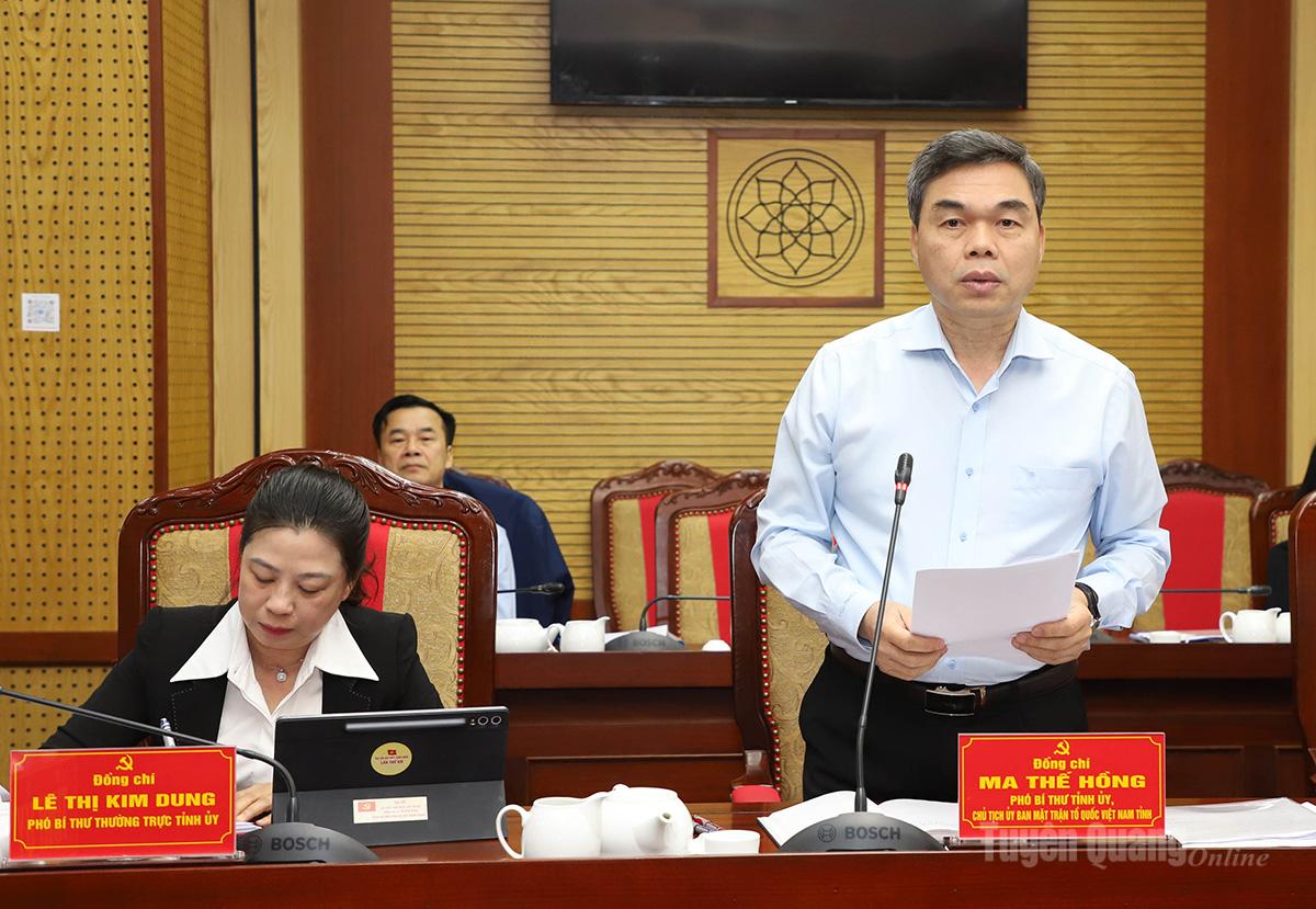 Phó Bí thư Tỉnh ủy, Chủ tịch Ủy ban MTTQ tỉnh Ma Thế Hồng trình bày kết quả công tác lãnh đạo, chỉ đạo thực hiện nhiệm vụ quý I/2026.