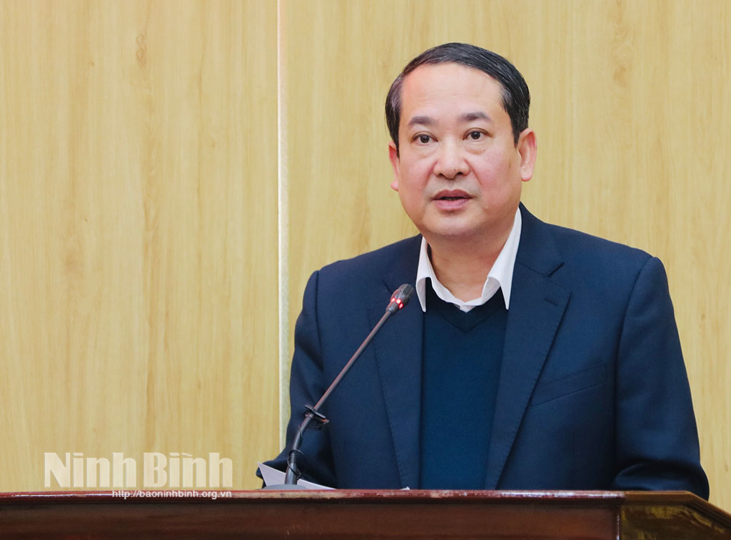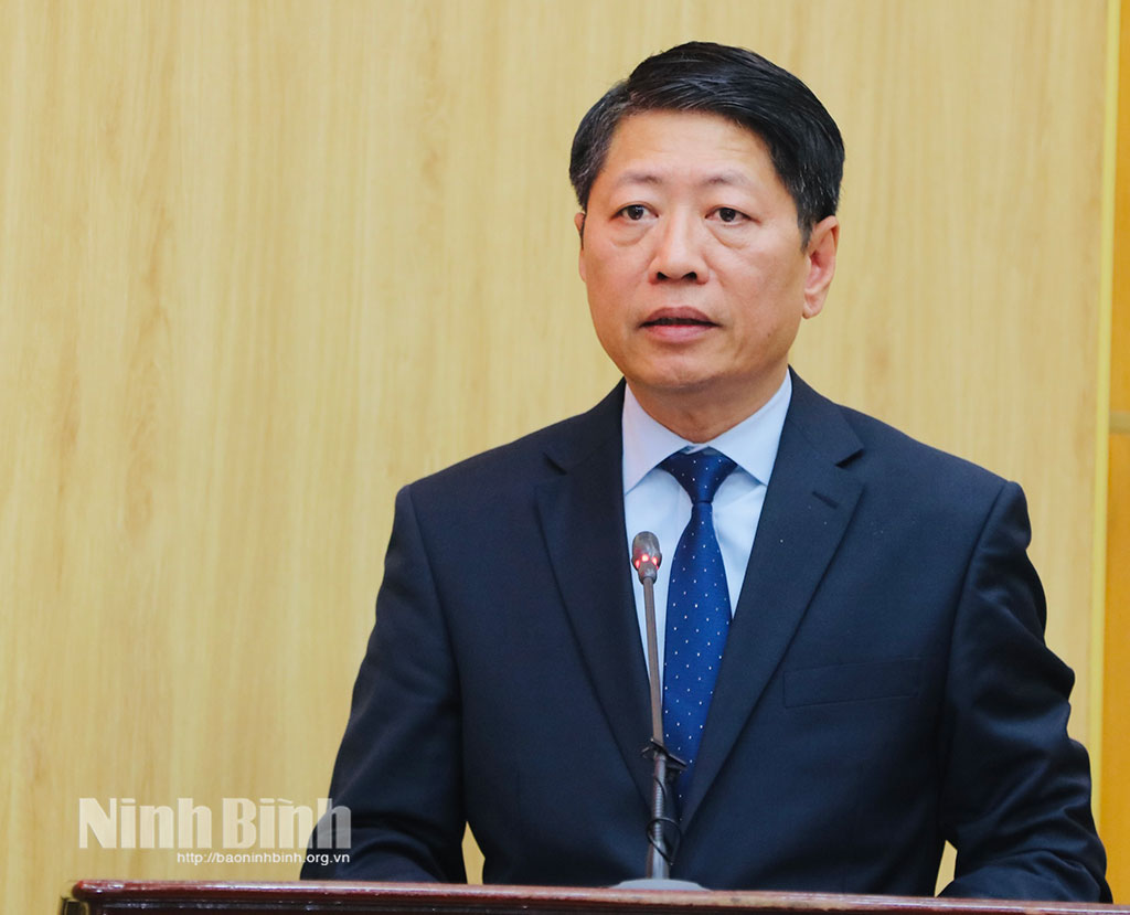 Đồng chí Trần Song Tùng, Ủy viên Ban Thường vụ Tỉnh ủy, Phó Chủ tịch Thường trực UBND tỉnh Ninh Bình báo cáo tình hình kinh tế - xã hội của tỉnh.
