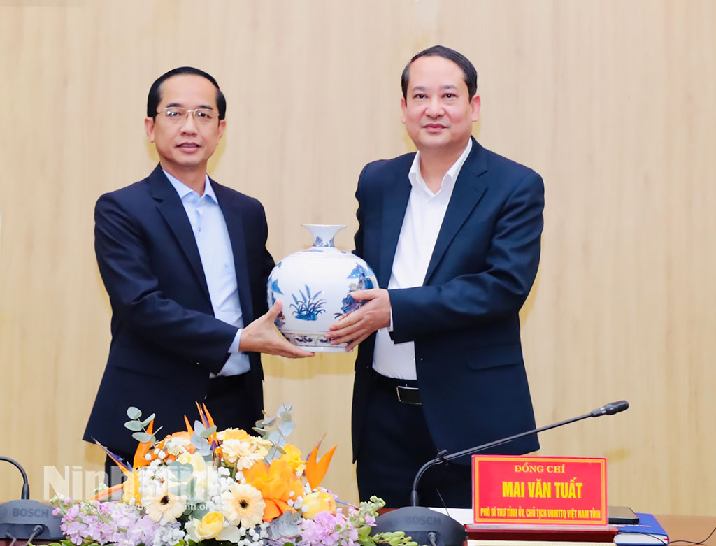 Đồng chí Hồ Thanh Thủy, Phó Bí thư Tỉnh ủy, Chủ tịch Ủy ban MTTQ Việt Nam tỉnh Cà Mau trao quà lưu niệm cho đồng chí Mai Văn Tuất, Phó Bí thư Tỉnh ủy, Chủ tịch Ủy ban MTTQ Việt Nam tỉnh Ninh Bình.