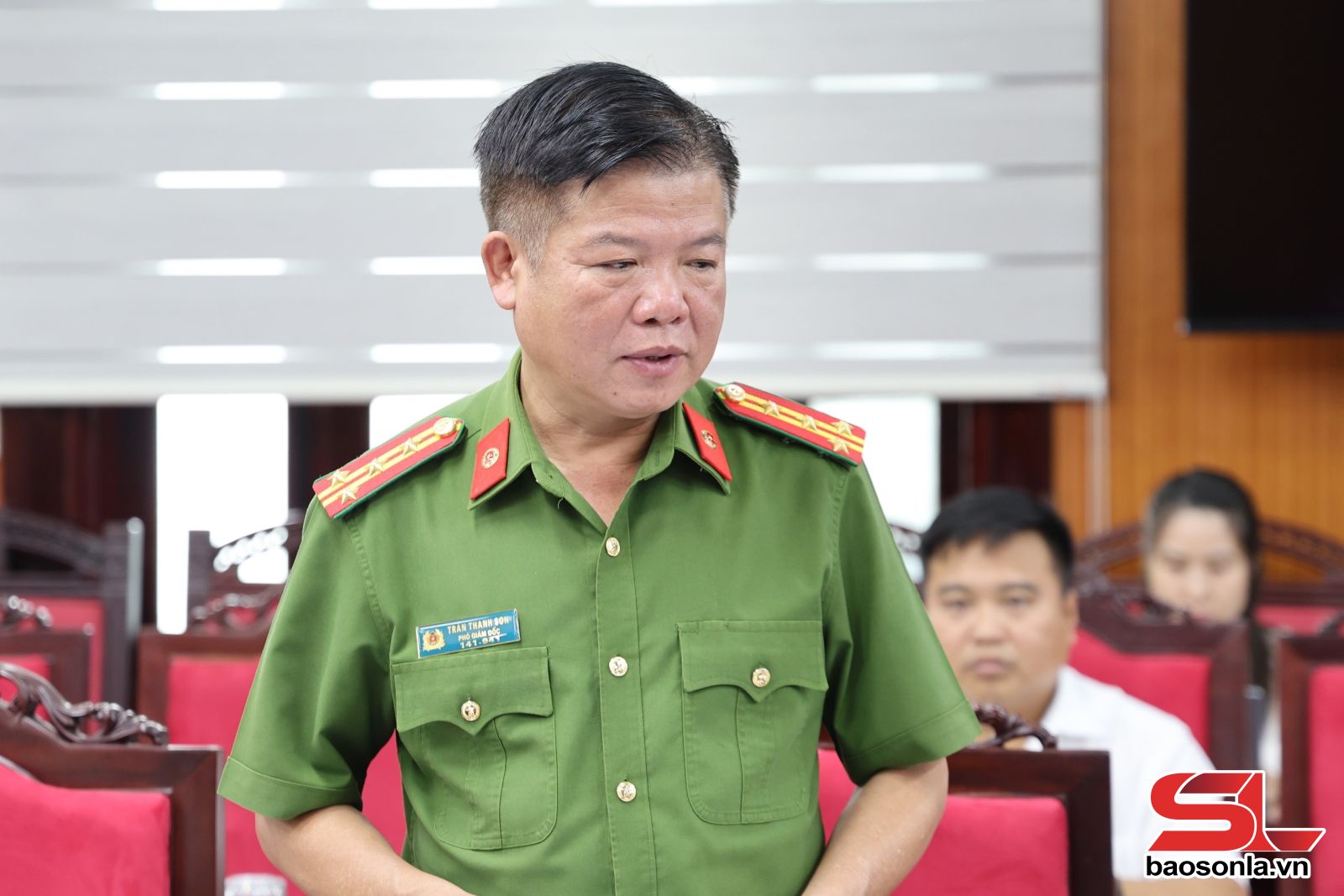 Đồng chí Phó Giám đốc Công an tỉnh phát biểu tại hội nghị.