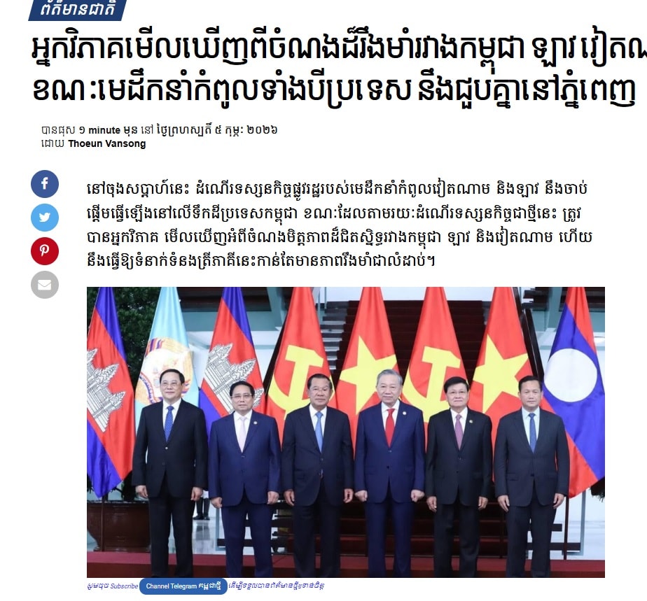 Truyền thông Campuchia những ngày qua đặc biệt nhấn mạnh chuỗi ba hội nghị cấp cao giữa các đảng cầm quyền Campuchia - Việt Nam - Lào, diễn ra trong hai ngày 6-7/2/2026, song song với chuyến thăm cấp Nhà nước của Tổng Bí thư Đảng Cộng sản Việt Nam Tô Lâm và chuyến thăm của Tổng Bí thư, Chủ tịch nước Lào Thongloun Sisoulith.