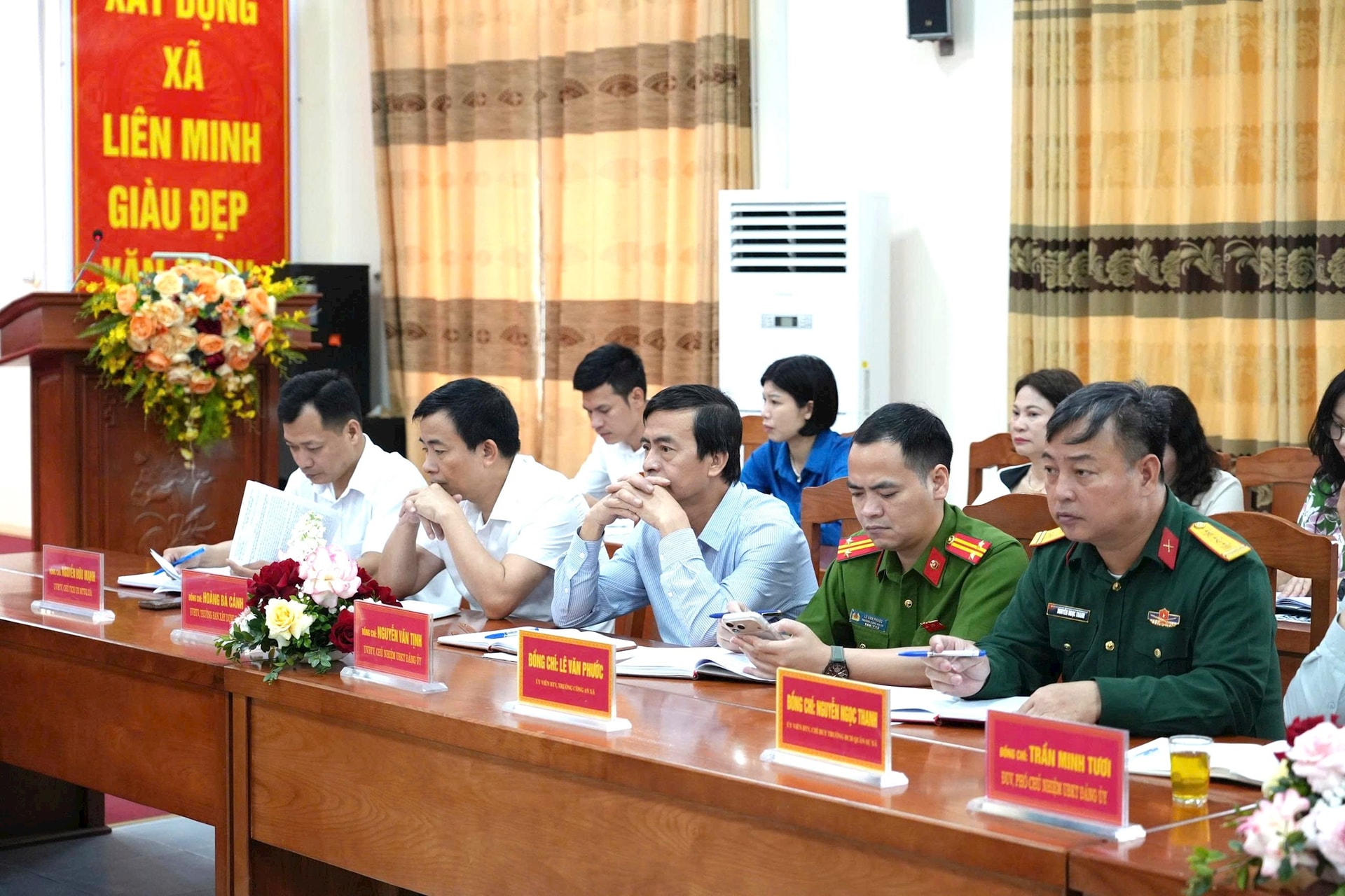 Bí thư Đảng ủy xã Liên Minh Nguyễn Tiến Toàn (giữa), Phó Bí thư Thường trực Đảng ủy xã Nguyễn Thị Hường, Chủ tịch UBND Nguyễn Quý Mạnh tham dự Hội nghị Ban Chấp hành Đảng bộ xã khóa I, nhiệm kỳ 2025-2030. Ảnh: Đào Thắm