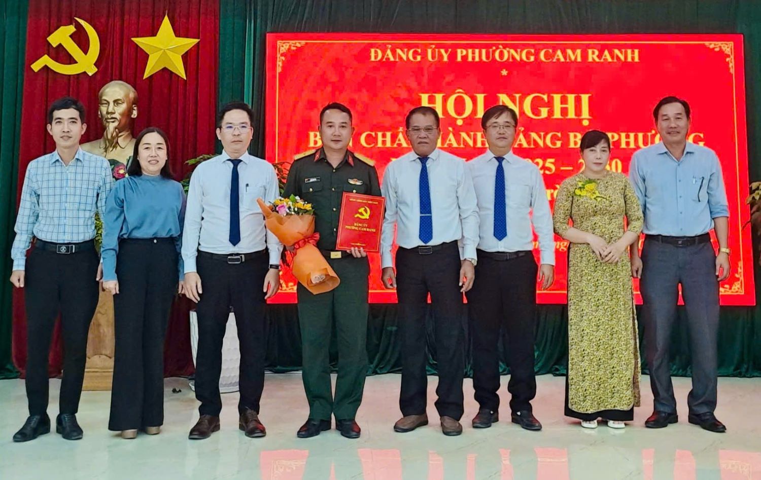 Lãnh đạo Đảng ủy phường Cam Ranh tặng hoa chúc mừng Thiếu tá Ngô Xuân Vũ.