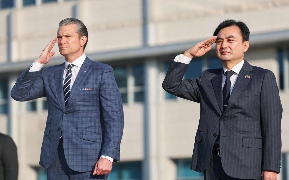 Bộ trưởng Quốc phòng Hàn Quốc Ahn Gyu-back (trái) và Bộ trưởng Bộ Chiến tranh Mỹ Pete Hegseth. Ảnh: Yonhap News.