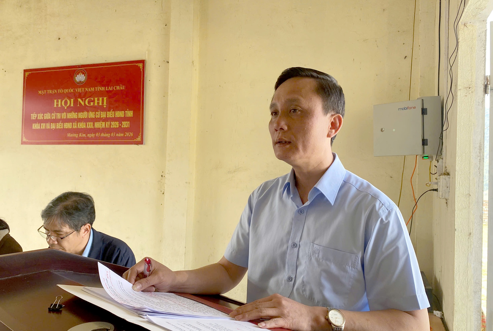 Tại hội nghị, đồng chí Hoàng Kiều Anh - Phó Chủ tịch Ủy ban MTTQ Việt Nam tỉnh thông tin dự kiến chương trình, nội dung hội nghị theo quy định. Lãnh đạo Ủy ban MTTQ Việt Nam xã Mường Kim giới thiệu danh sách, tiểu sử tóm tắt của 5 người ứng cử đại biểu HĐND cấp tỉnh và 5 người ứng cử đại biểu HĐND xã nhiệm kỳ 2026 - 2031 để cử tri theo dõi, nghiên cứu.