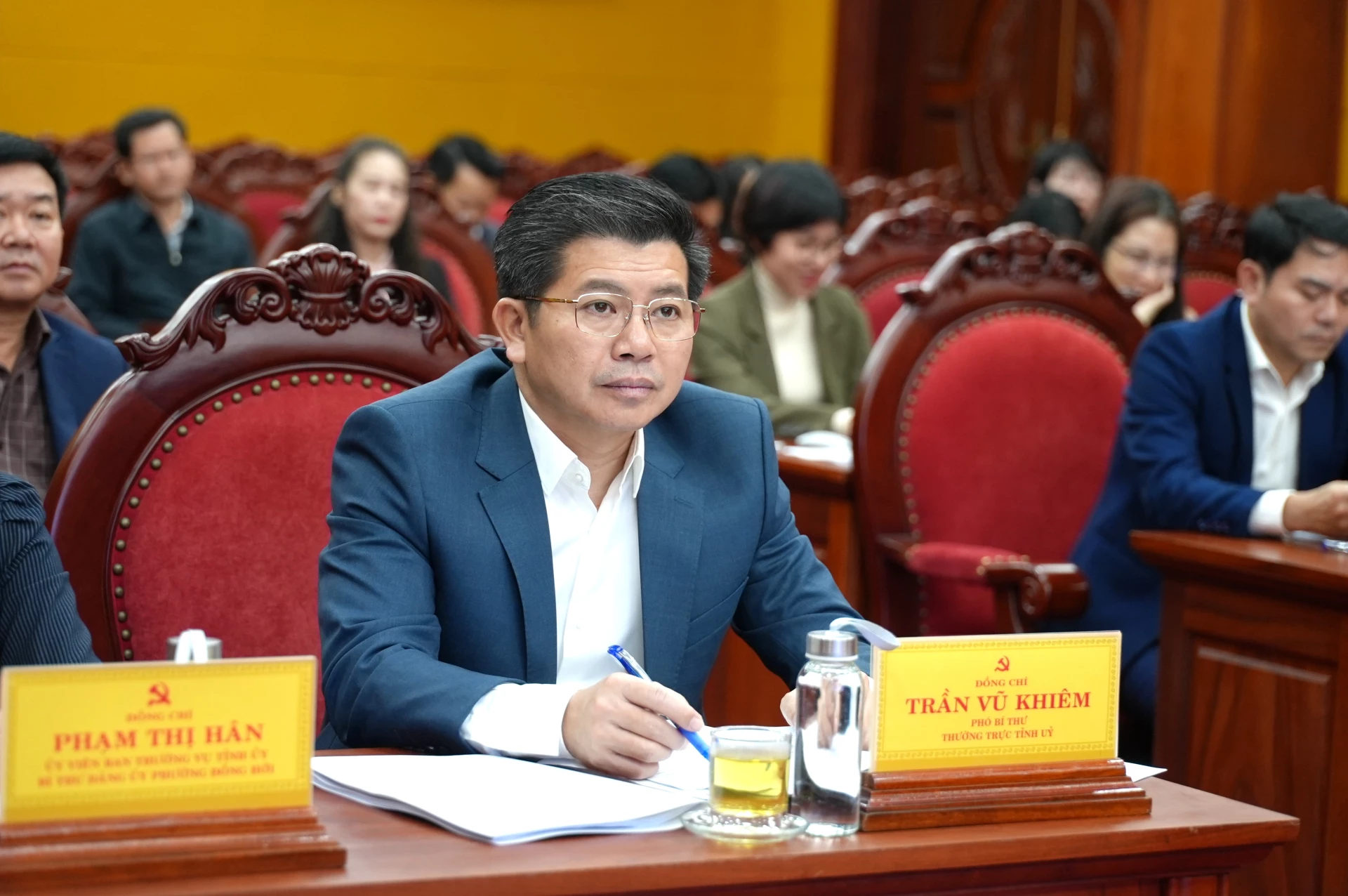Dự hội nghị tại điểm cầu Quảng Trị có các đồng chí: Trần Vũ Khiêm, Phó Bí thư Thường trực Tỉnh ủy; Lê Văn Bảo, Ủy viên Ban Thường vụ Tỉnh ủy, Chánh Văn phòng Tỉnh ủy, Phó Chủ tịch UBND tỉnh; Phạm Thị Hân, Ủy viên Ban Thường vụ Tỉnh ủy, Bí thư Đảng ủy phường Đồng Hới và đại điện các đảng ủy trực thuộc Tỉnh ủy.