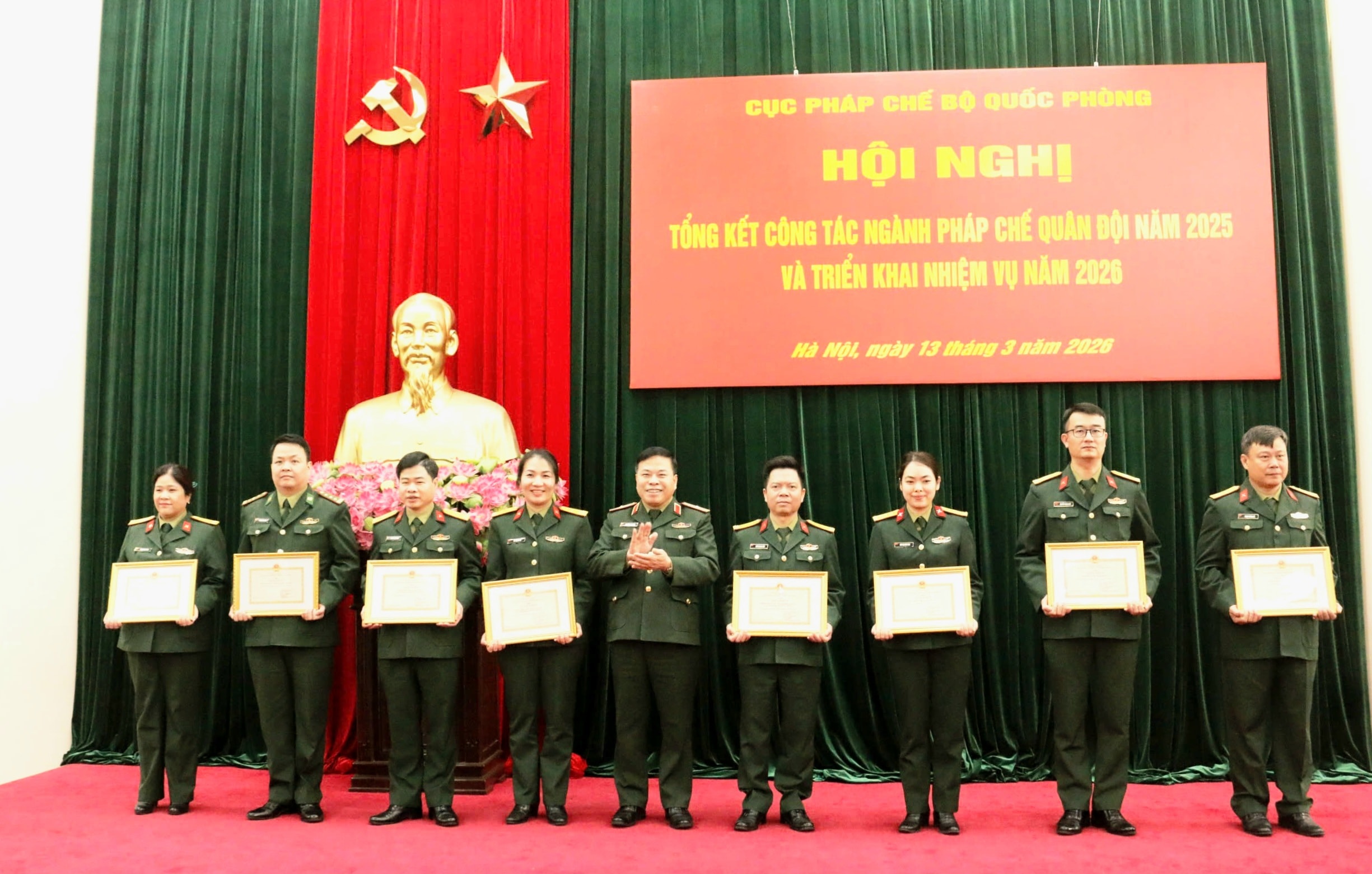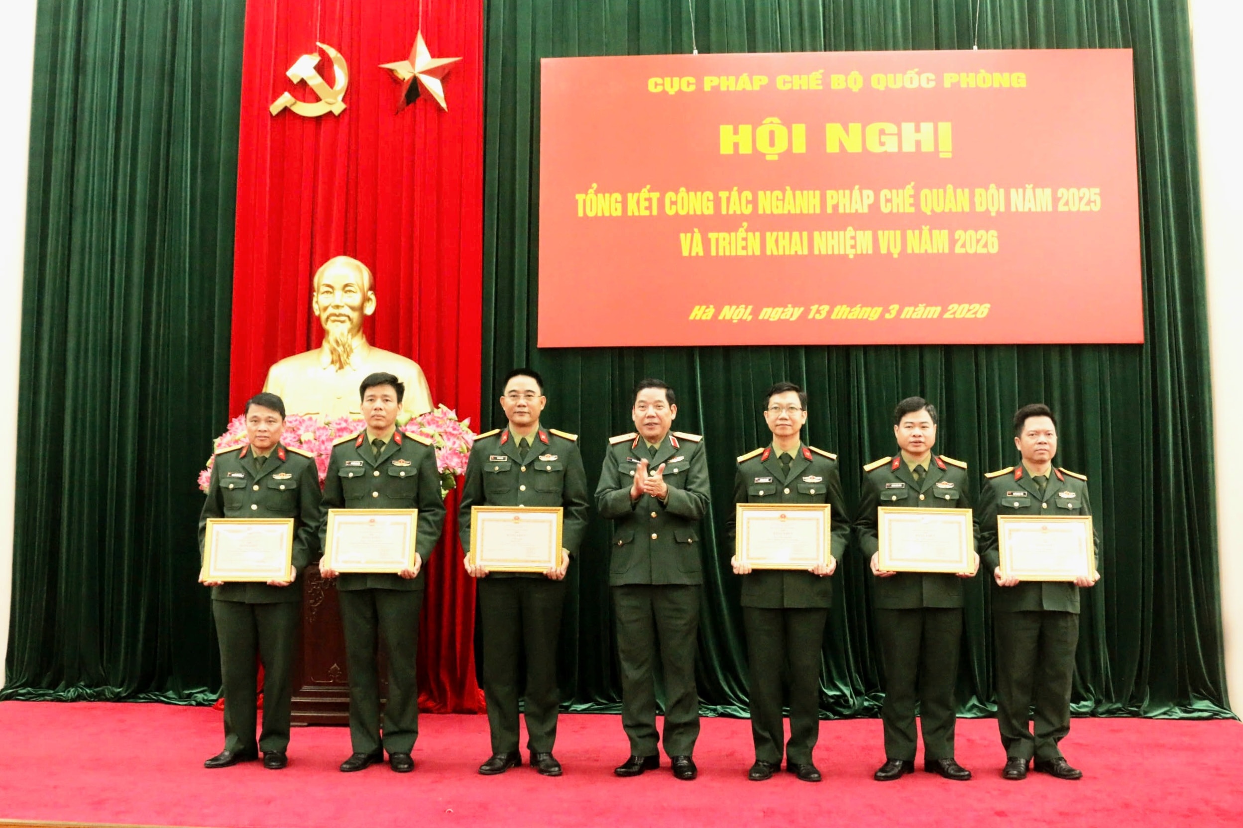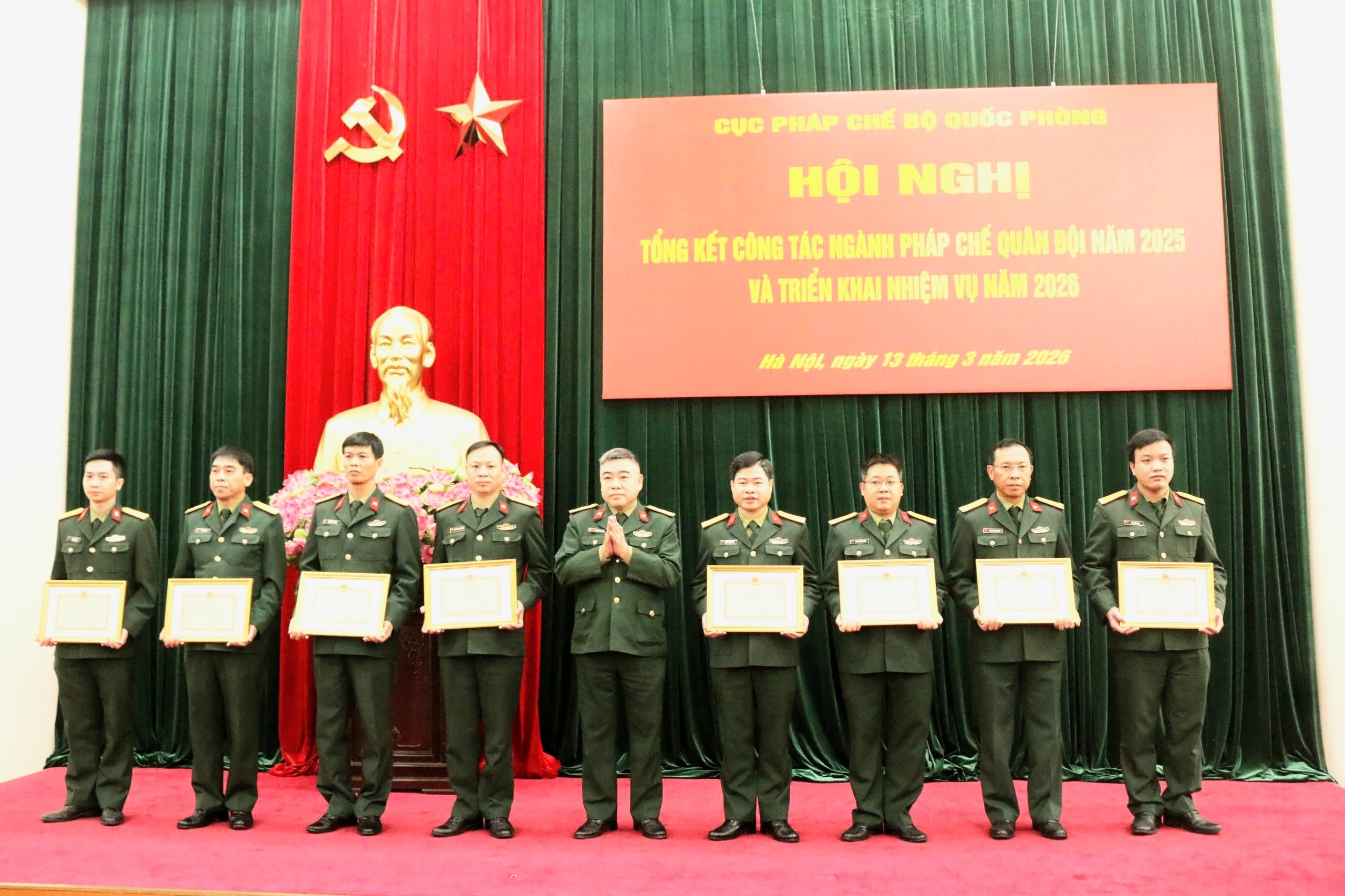 Thiếu tướng Nguyễn Việt Dũng, Cục trưởng Cục Pháp chế Bộ Quốc phòng trao Giấy khen cho đại diện các tập thể có thành tích xuất sắc trong công tác tham mưu, xây dựng và hoàn thiện thể chế pháp luật về quân sự, quốc phòng năm 2025. Ảnh: Thảo Mộc