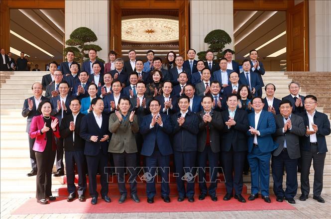 Thủ tướng Phạm Minh Chính với lãnh đạo các Đảng bộ trực thuộc Đảng bộ Chính phủ. Ảnh: Dương Giang/TTXVN