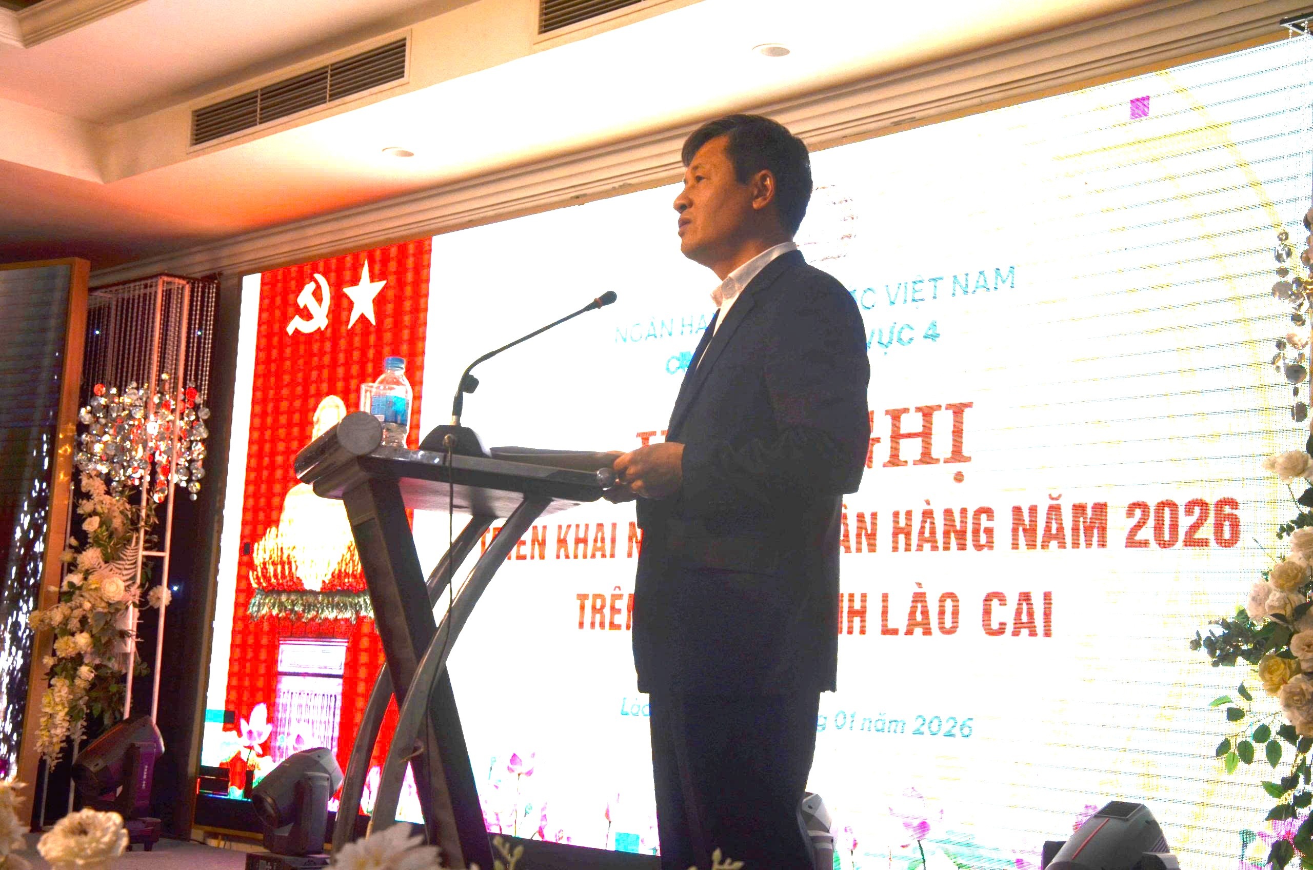 Phát biểu tại Hội nghị, đồng chí Ngô Hạnh Phúc - Ủy viên Ban Thường vụ Tỉnh ủy, Phó Chủ tịch UBND tỉnh Lào Cai ghi nhận những nỗ lực của ngành Ngân hàng Khu vực 4 nói chung và địa bàn tỉnh Lào Cai nói riêng trong năm 2025, trong đó đánh giá cao sự chỉ đạo sát sao của NHNN chi nhánh Khu vực 4. Năm 2025, NHNN Khu vực 4 mặc dù mới đi vào hoạt động theo mô hình tổ chức mới, nhưng đã chỉ đạo rất quyết liệt các ngân hàng thực hiện sự điều hành chính sách tiền tệ của Chính phủ, NHNN, tập trung triển khai những nhiệm vụ trọng tâm của ngành, đã phục vụ tốt, có hiệu quả cho sự nghiệp phát triển kinh tế - xã hội địa phương, đặc biệt phải nói đến công tác tham mưu cho cấp ủy, chính quyền địa phương về các nội dung liên quan đến lĩnh vực ngân hàng trên địa bàn; tăng trưởng tín dụng ở mức khá; chất lượng tín dụng vẫn được đảm bảo, tỷ lệ nợ xấu toàn địa bàn ở trong ngưỡng an toàn dưới 1%; các ngân hàng Lào Cai đã triển khai tốt các giải pháp hỗ trợ người dân, doanh nghiệp gặp khó khăn, nhất là các giải pháp hỗ trợ trực tiếp, rất kịp thời, thiết thực, hiệu quả của ngân hàng đến người dân, doanh nghiệp bị ảnh hưởng bởi thiên tai, dịch bênh; những giải pháp này đã giúp người dân, doanh nghiệp nhanh chóng ổn định cuộc sống, quay trở lại hoạt động sản xuất, kinh doanh.