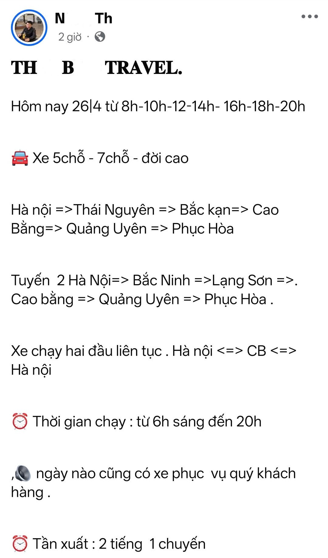 Còn nhóm “Xe ghép, xe tiện chuyến Cao Bằng-Hà Nội” với hơn 46.500 thành viên cũng liên tục có các bài viết quảng cáo xe, dịch vụ. Thành viên có tên “N. Th” quảng cáo có xe 5 chỗ, 7 chỗ đời cao, ngày 26-4 có các chuyến từ 8 giờ đến 20 giờ (cách 2 giờ có một chuyến) với 2 tuyến: Hà Nội-Thái Nguyên-Bắc Kạn (cũ)-Cao Bằng-Quảng Uyên-Phục Hòa và Hà Nội-Bắc Ninh-Lạng Sơn-Cao Bằng-Quảng Uyên-Phục Hòa.