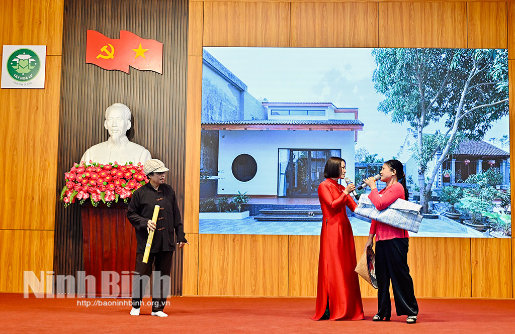 Các đồng chí: Trần Thị Thoa, Phó Chủ tịch Ủy ban MTTQ Việt Nam tỉnh; Nguyễn Thị Thu Thủy, Phó Giám đốc Báo và phát thanh, truyền hình Ninh Bình tặng hoa chúc mừng 12 thí sinh tiêu biểu, xuất sắc đại diện của 12 cụm thi đua tham dự Hội thi.
