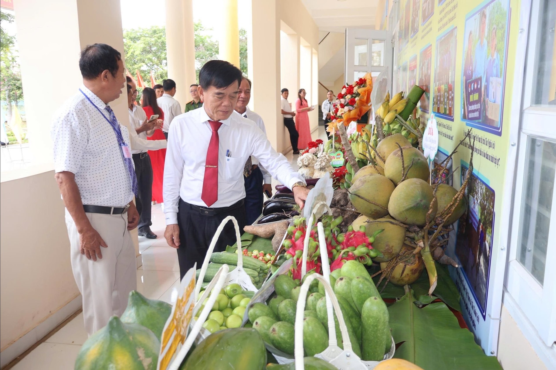 Ông Dương Văn Đông, Bí thư Đảng ủy xã Hàm Tân tham quan các gian hàng trưng bày tại Đại hội