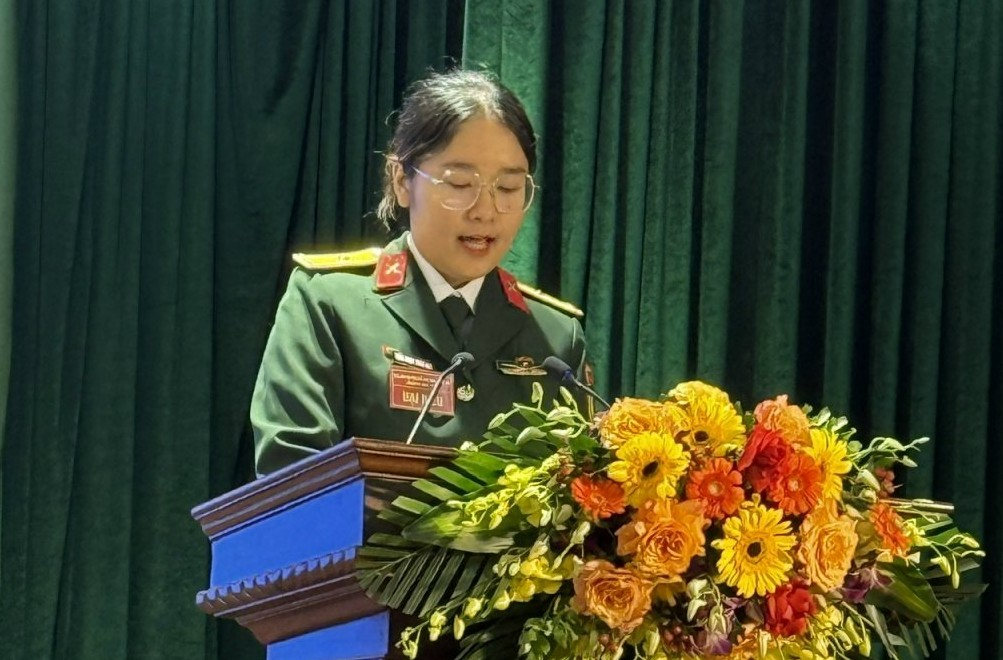 Thiếu úy Trần Ngọc Châu Anh, Trợ lý Phát hành sách phát biểu tại đại hội.
