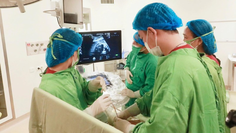 Bác sĩ Trung tâm Can thiệp bào thai, Bệnh viện Phụ sản Hà Nội dẫn lưu dịch từ khoang màng phổi ra ngoài buồng ối.