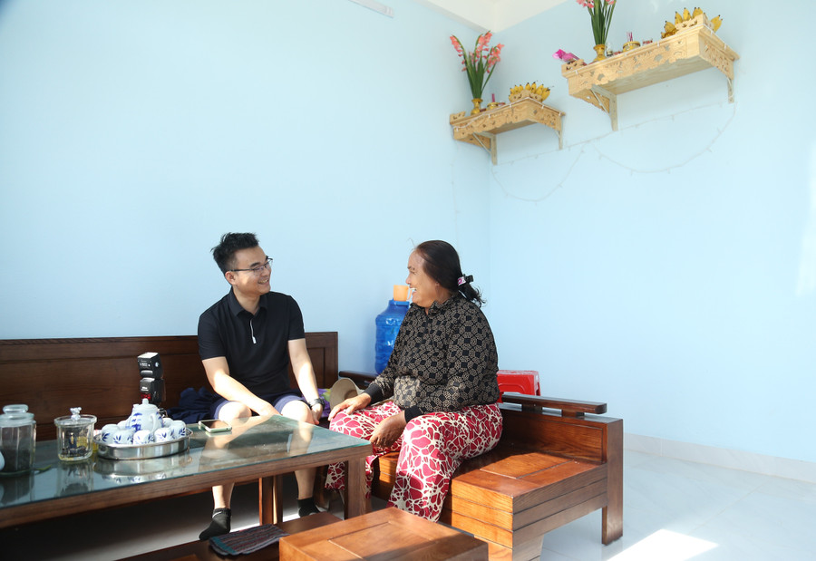 Bà Tuấn vui vẻ trò chuyện với khách trong trên bộ bàn ghế sofa được tỉnh tặng dịp nhận nhà mới để đón Tết. Ảnh: Hồng Phúc