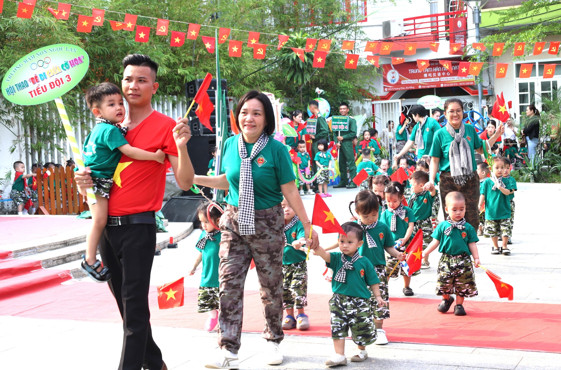 Hội thao chú bộ đội dẫn đầu đoàn diễu hành, theo sau là giáo viên và các bé Trường Mầm non Ngọc Lan. Ảnh: NGỌC HÀ