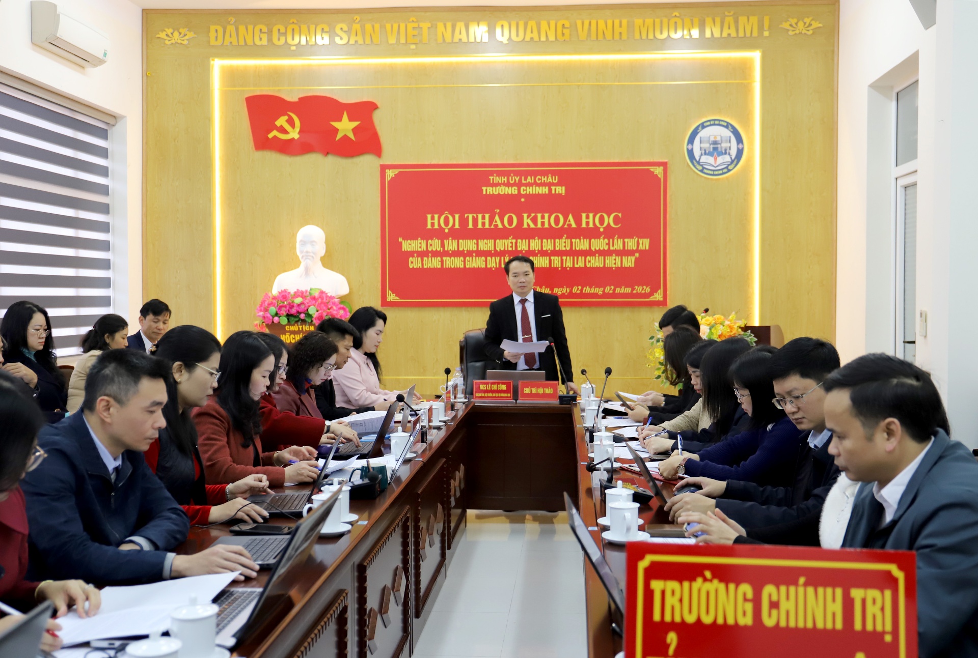 Các đồng chí: Nghiên cứu sinh Lê Chí Công - Tỉnh ủy viên, Hiệu trưởng, Chủ tịch Hội đồng Khoa học Trường Chính trị tỉnh; Thạc sĩ Tạ Ngọc Thủy - Phó Hiệu trưởng, Phó Chủ tịch Thường trực Hội đồng Khoa học Trường Chính trị tỉnh chủ trì hội thảo. Dự hội thảo còn có lãnh đạo Báo và Phát thanh, truyền hình tỉnh; Trường Cao đẳng Lai Châu; đại diện các Trung tâm chính trị cấp xã trên địa bàn tỉnh; Ban Giám hiệu, lãnh đạo các khoa, phòng, giảng viên, viên chức và học viên Trường Chính trị tỉnh.