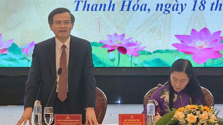 Các đồng chí Ủy viên Trung ương Đảng: Bùi Thị Quỳnh Vân, Phó Trưởng Ban Tổ chức Trung ương; Đoàn Minh Huấn, Phó Giám đốc thường trực Học viện Chính trị Quốc gia Hồ Chí Minh; Nguyễn Doãn Anh, Bí thư Tỉnh ủy Thanh Hóa chủ trì hội thảo.