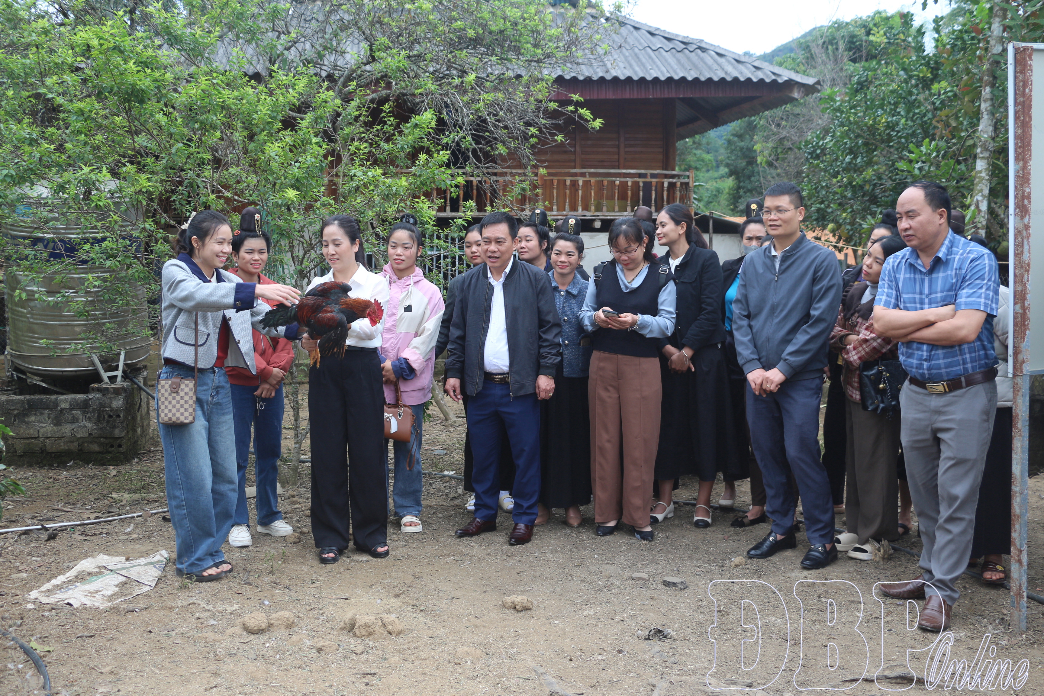 Đại biểu tham quan thực tế mô hình chăn nuôi gà Lạc Thủy chứng nhận VietGAHP tại hộ Quàng Văn Phương, bản Pá Tra, xã Búng Lao