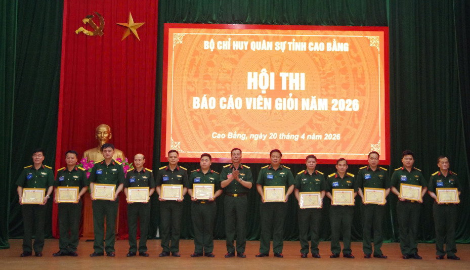 Kết thúc hội thi, Ban Tổ chức trao 2 giải nhất, 4 giải nhì, 6 giải ba cho các thí sinh đạt thành tích cao, trong đó, 2 giải nhất thuộc về Đại tá Đàm Lê Ngọc Khôi, Chính ủy Ban Chỉ huy Phòng thủ khu vực 2 - Bảo Lạc; Thiếu tá Hứa Văn Quang, Chính trị viên Tiểu đoàn 5, Trung đoàn 852; trao giấy chứng nhận danh hiệu “Báo cáo viên giỏi” năm 2026 cho 15 đồng chí và lựa chọn những báo cáo viên xuất sắc tham gia Hội thi báo cáo viên cấp Quân khu trong thời gian tới.