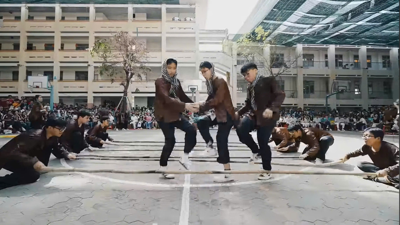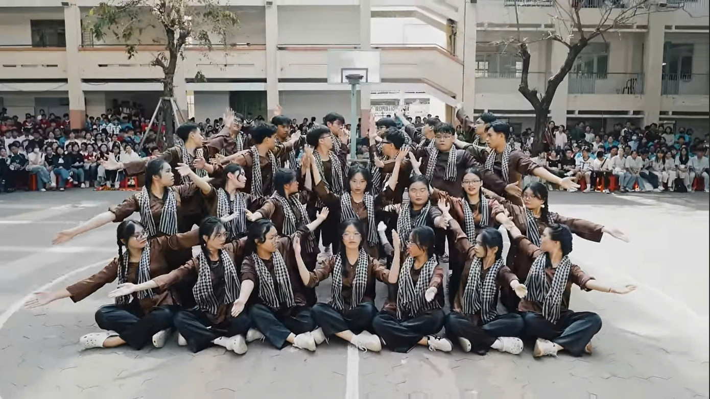 Không phải những điệu nhảy K-Pop hay EDM sôi động thường thấy, các bạn học sinh lớp 12K đã chọn âm hưởng quê hương làm điểm nhấn. Tiếng đàn, câu hò dân ca của bài hát Sóc Trăng Drill - Jombie vang lên giữa sân trường, hòa cùng nhịp beat hiện đại khiến ai xem cũng phải thốt lên “wow”.