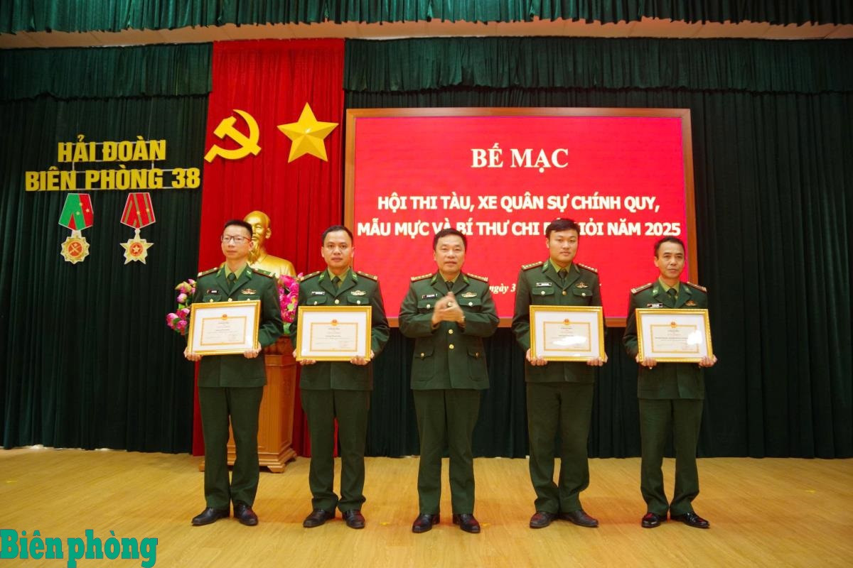 Đại tá Nguyễn Văn Sưởng, Bí thư Đảng ủy, Chính ủy Hải đoàn Biên phòng 38 (thứ 2, từ trái sang) trao thưởng cho các cá nhân có thành tích xuất sắc tại Hội thi Bí thư Chi bộ tàu giỏi năm 2025. Ảnh: Hà Vinh