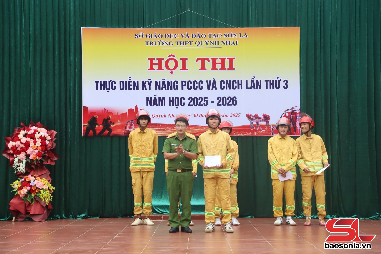 Đại diện Phòng Cảnh sát Phòng cháy chữa cháy và Cứu nạn cứu hộ - Công an tỉnh Sơn La; Trường THPT Quỳnh Nhai trao giải cho các đội thi.