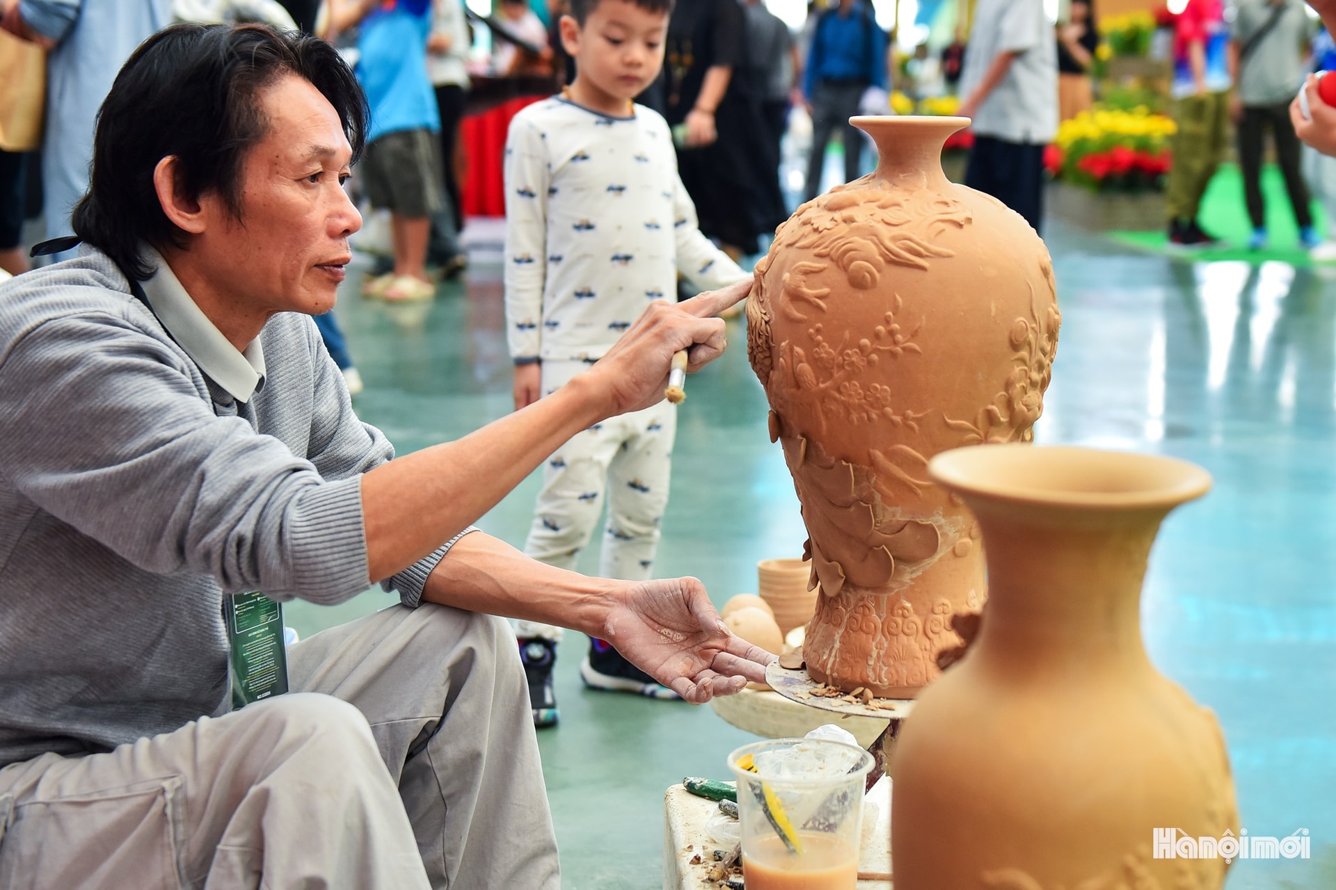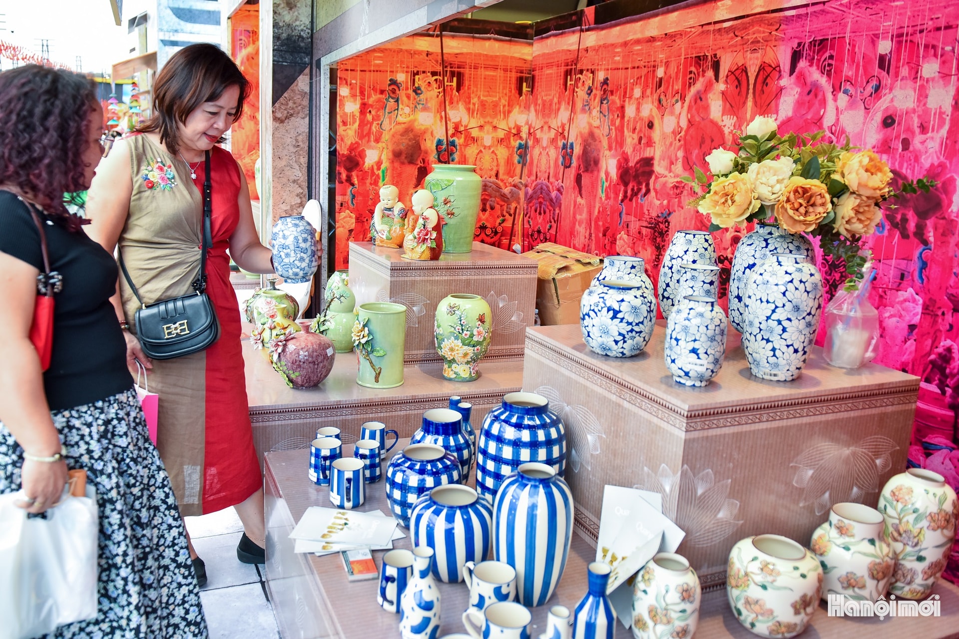 Những bình gốm với hoa văn tinh xảo, lớp men óng ánh dưới sáng, thu hút ánh nhìn của người qua lại.