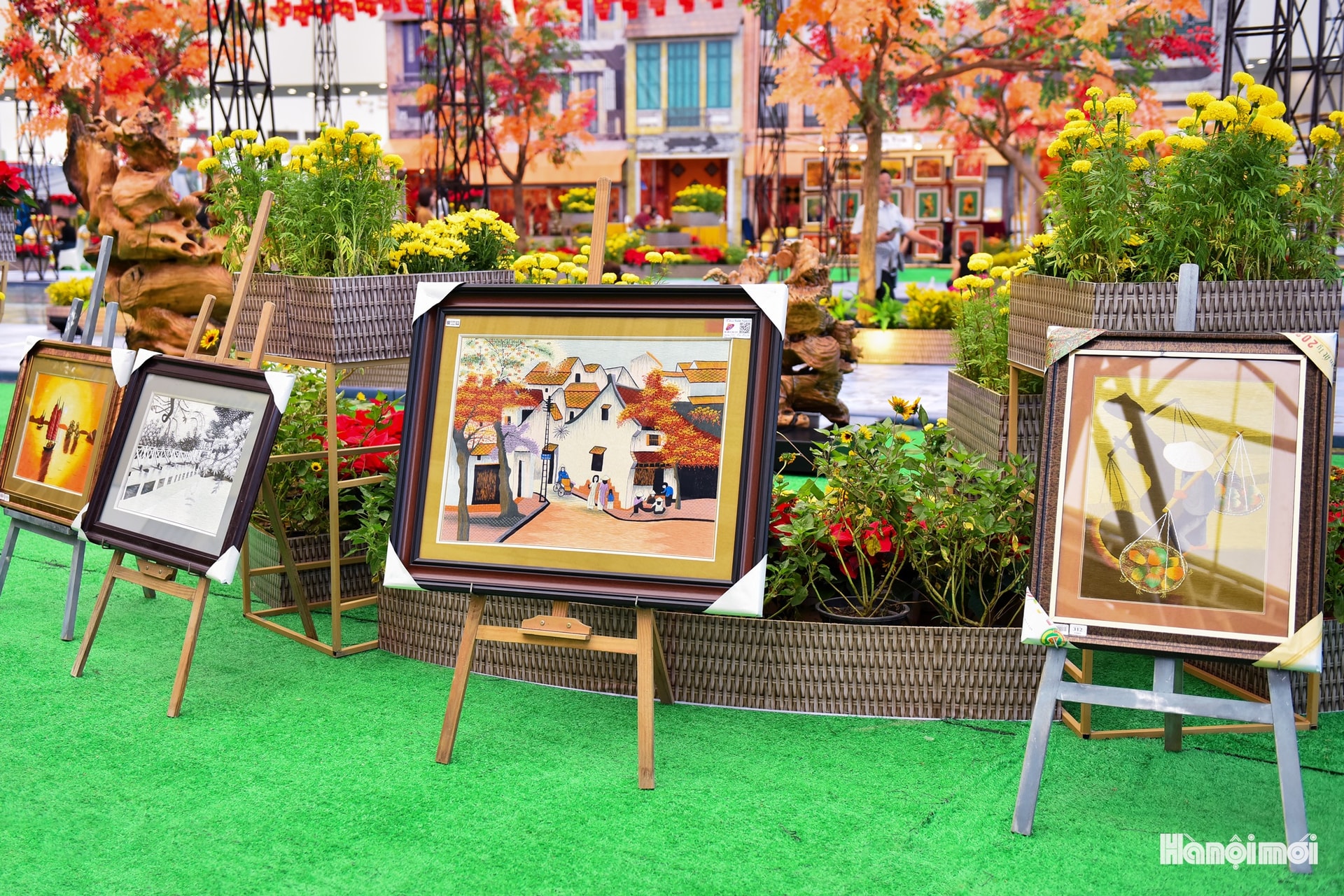 Gian hàng tranh vẽ với gam màu tươi sáng, thể hiện nét đặc trưng cuộc sống Việt.