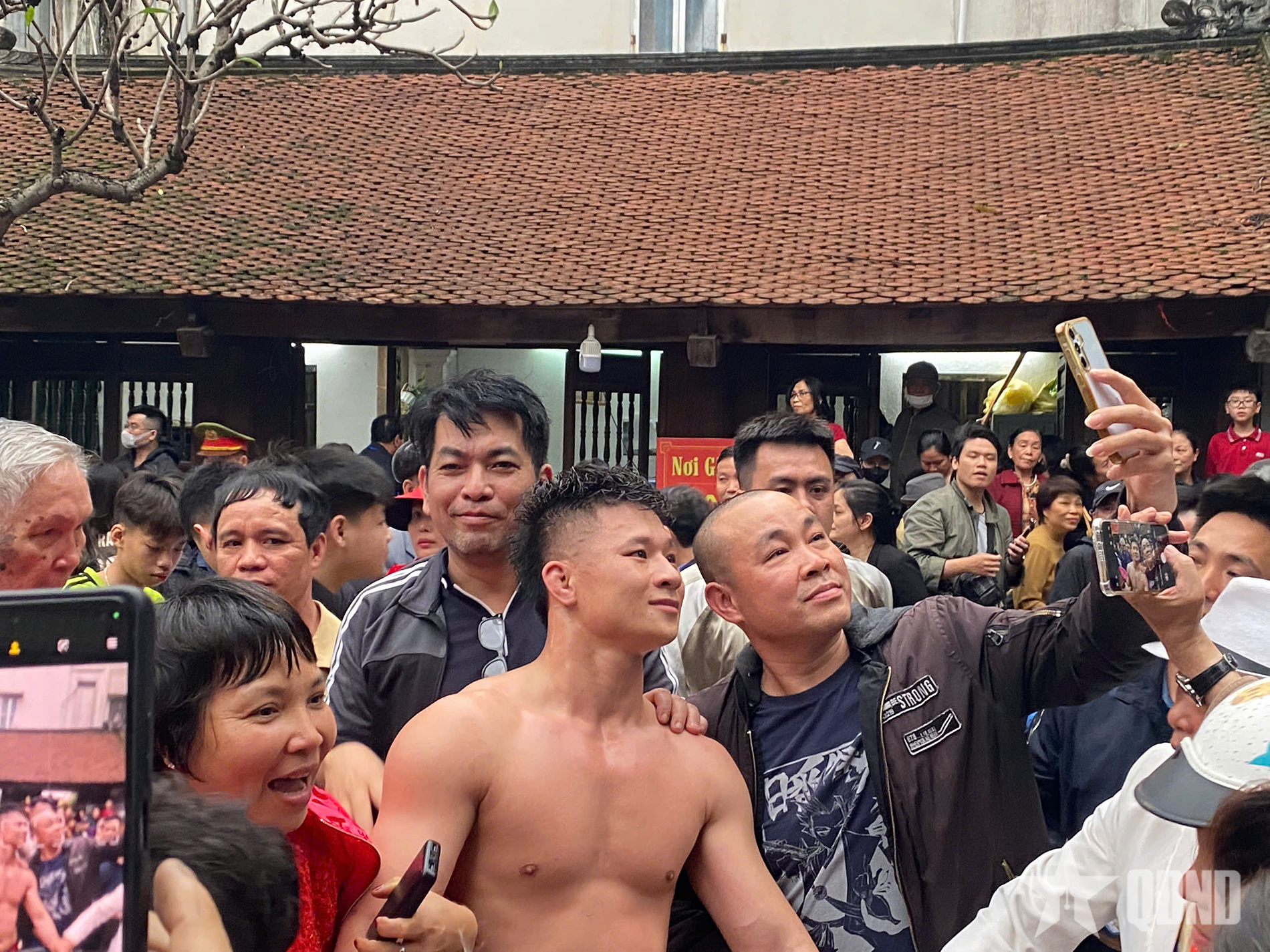 Người dân và du khách chụp ảnh với đô vật giành giải Nhất.