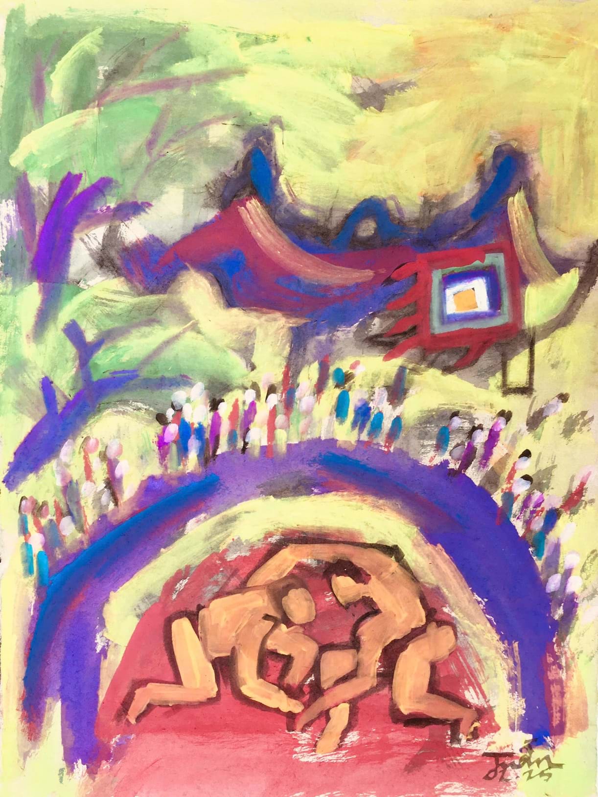 Hội vật diễn ra vào đầu năm không chỉ để vui chơi, mà còn mang ý nghĩa cầu cho mùa màng bội thu, cho trai tài gái sắc gặp nhau, già trẻ hân hoan cho cộng đồng hưng thịnh. Tranh: Trần Tuấn