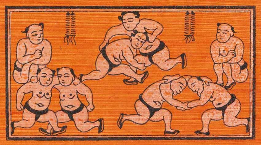 Hội vật ngày xuân là một truyền thống văn hóa được thể hiện vui vẻ, hài hòa trên tranh dân gian Đông Hồ. Ảnh: TL