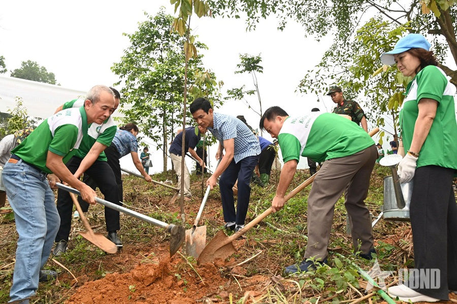 Lãnh đạo Trung tâm Dịch vụ môi trường và hạ tầng kỹ thuật (Khu Di tích lịch sử Đền Hùng) cùng hội viên Hội yêu rác các địa phương trồng cây xanh.