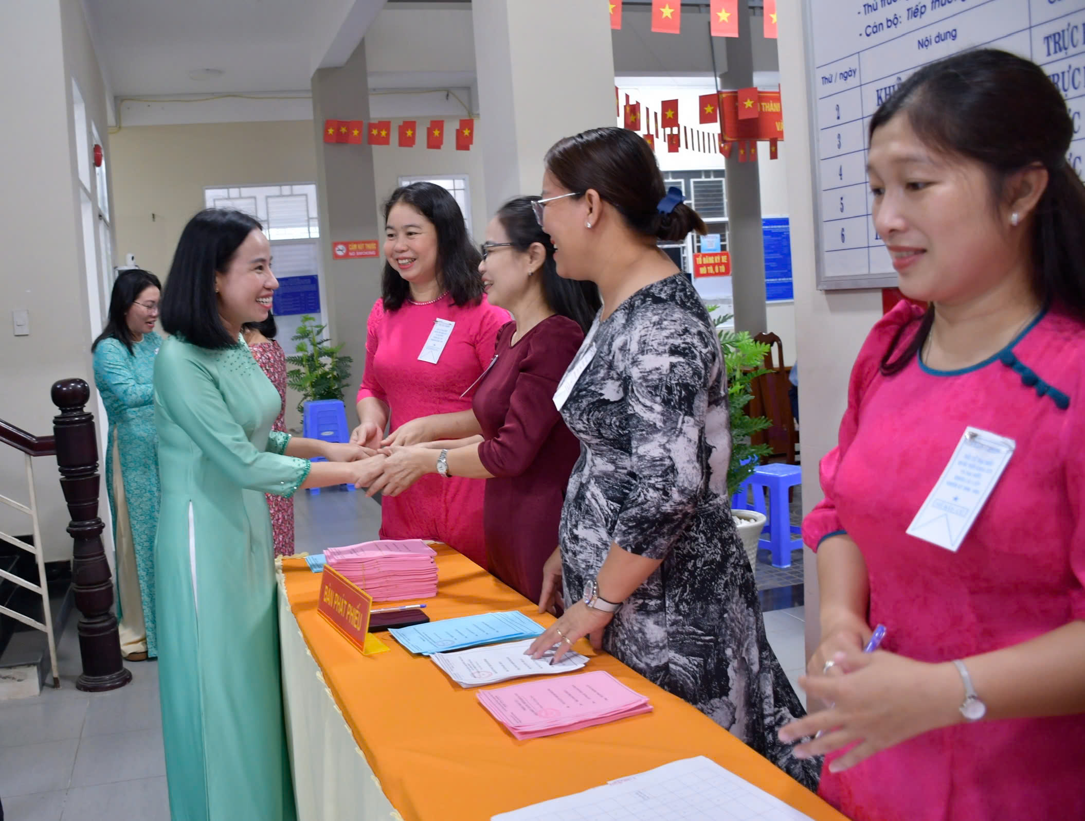 Đồng chí Võ Ngọc Thanh Trúc, Ủy viên Ban Thường vụ Thành ủy, Phó Chủ tịch Ủy ban MTTQ Việt Nam TPHCM, Chủ tịch Hội Liên hiệp Phụ nữ TPHCM có mặt tại khu vực bỏ phiếu số 3 (xã Long Điền, TPHCM). Ảnh: TRÚC GIANG