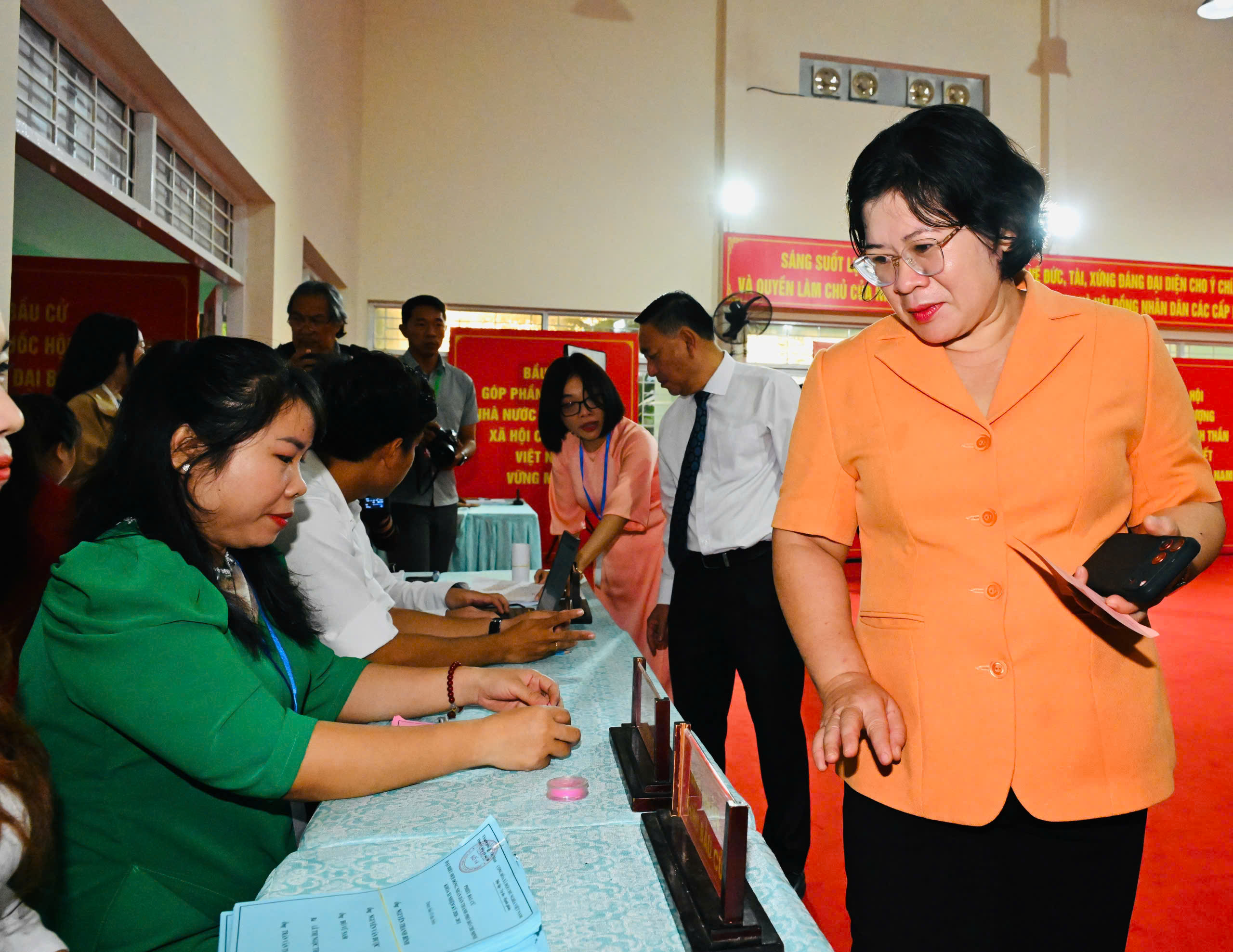 Đồng chí Văn Thị Bạch Tuyết, Phó Bí thư Thành ủy TPHCM đến kiểm tra công tác chuẩn bị trước giờ khai mạc tại Khu vực bỏ phiếu số 14 (Trường THCS Đỗ Văn Dậy, xã Hóc Môn, TPHCM). Ảnh: VIỆT DŨNG