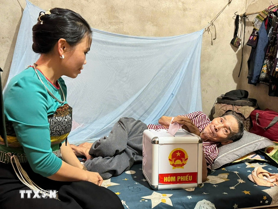 Cử tri Hà Văn Côi bị tai biến nằm một chỗ được Tổ bầu cử số 3 bản Na Nghịu, xã biên giới Sơn Điện (Thanh Hóa) đưa hòm phiếu lưu động đến nhà để thực hiện quyền bầu cử. ((Ảnh: Việt Hoàng/TTXVN)