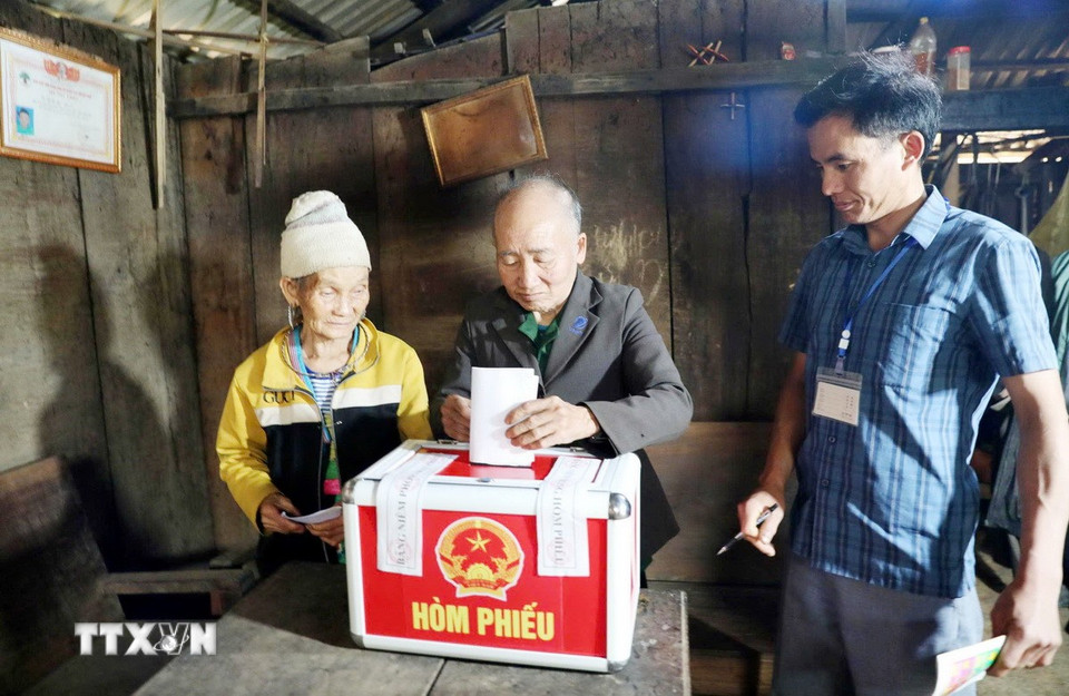 Tổ bầu cử bản Ché Lầu, xã biên giới Na Mèo (Thanh Hóa) mang hòm phiếu lưu động đến nhà ông bà Thao Văn Tho (90 tuổi), dân tộc Mông, sức yếu, hoàn cảnh khó khăn để cử tri được bầu cử. (Ảnh: Việt Hoàng/TTXVN)