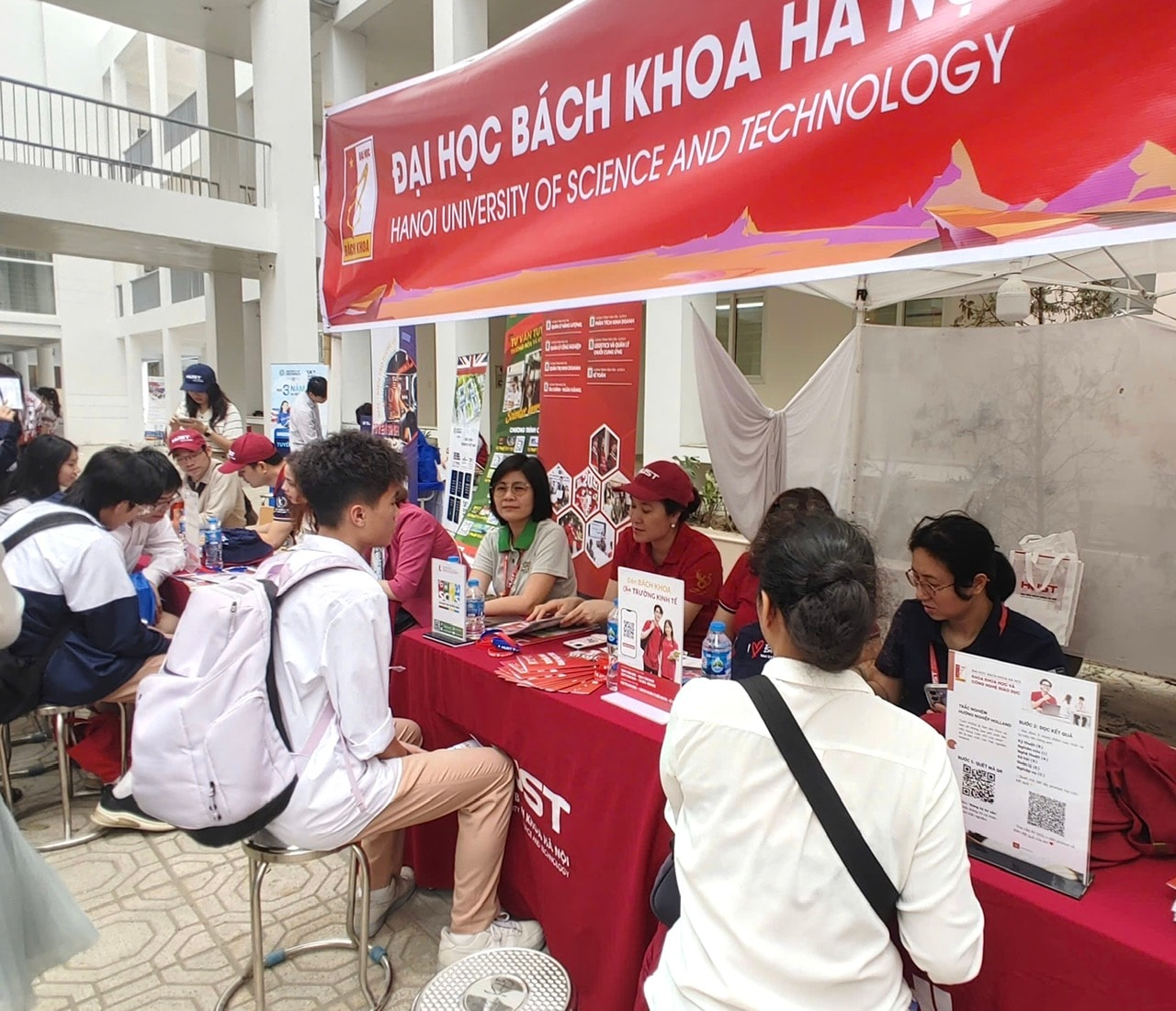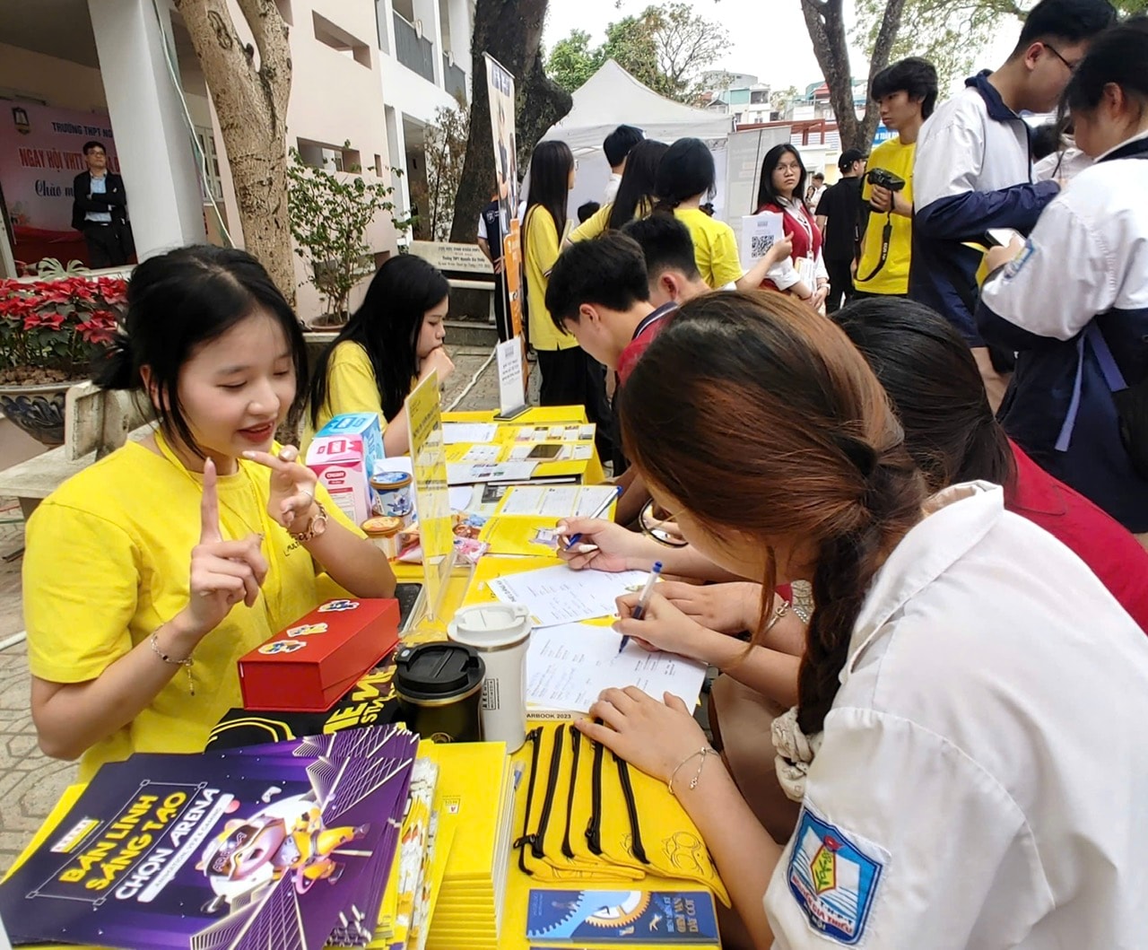 Ngoài khu tư vấn chính, khuôn viên nhà trường còn bố trí các gian tư vấn của gần 30 cơ sở đào tạo trình độ đại học, cao đẳng, giúp học sinh tiếp cận thông tin chính thống, từ đó chủ động hơn trong việc lựa chọn ngành nghề và định hướng tương lai.