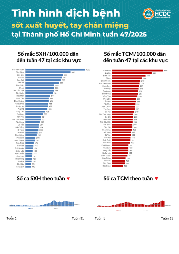 Trong khi đó, bệnh tay chân miệng tiếp tục có xu hướng tăng. Tuần 47, toàn thành phố ghi nhận 1.547 ca, tăng 15% so với trung bình 4 tuần trước. Số ca tích lũy từ đầu năm 2025 đến nay là 32.637. Những khu vực có tỉ lệ mắc tay chân miệng cao trên 100.000 dân gồm Côn Đảo, Nhà Bè và Bình Tân.