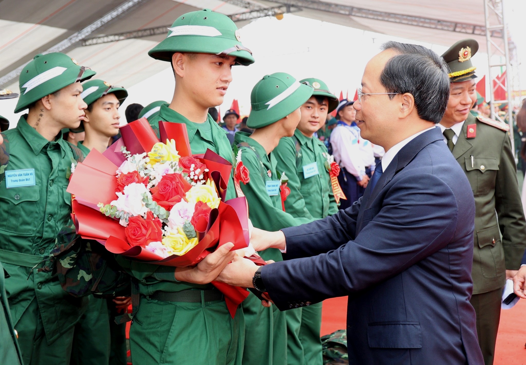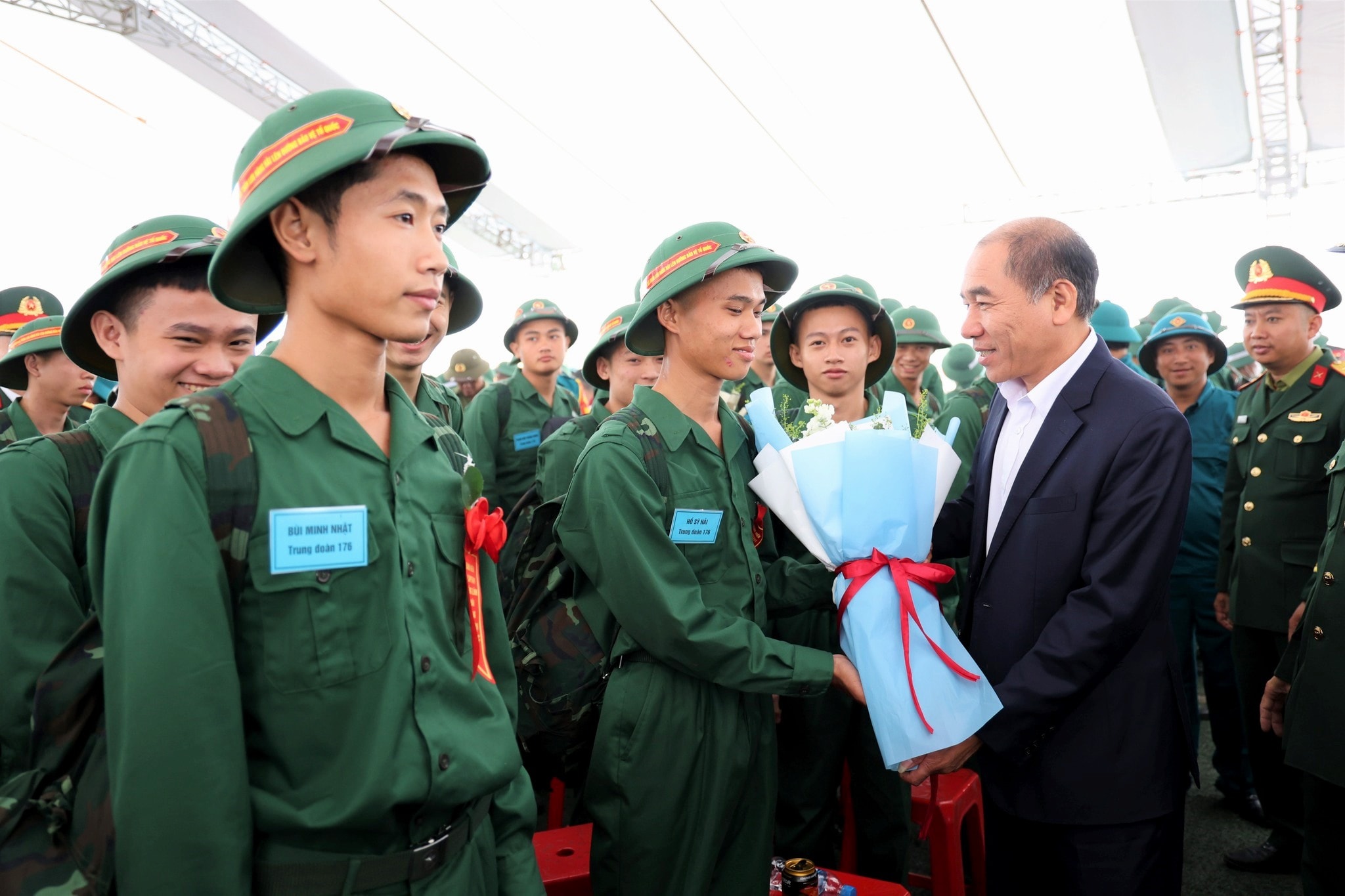 Bí thư Tỉnh ủy Hà Tĩnh Nguyễn Duy Lâm tặng hoa chúc mừng các tân binh